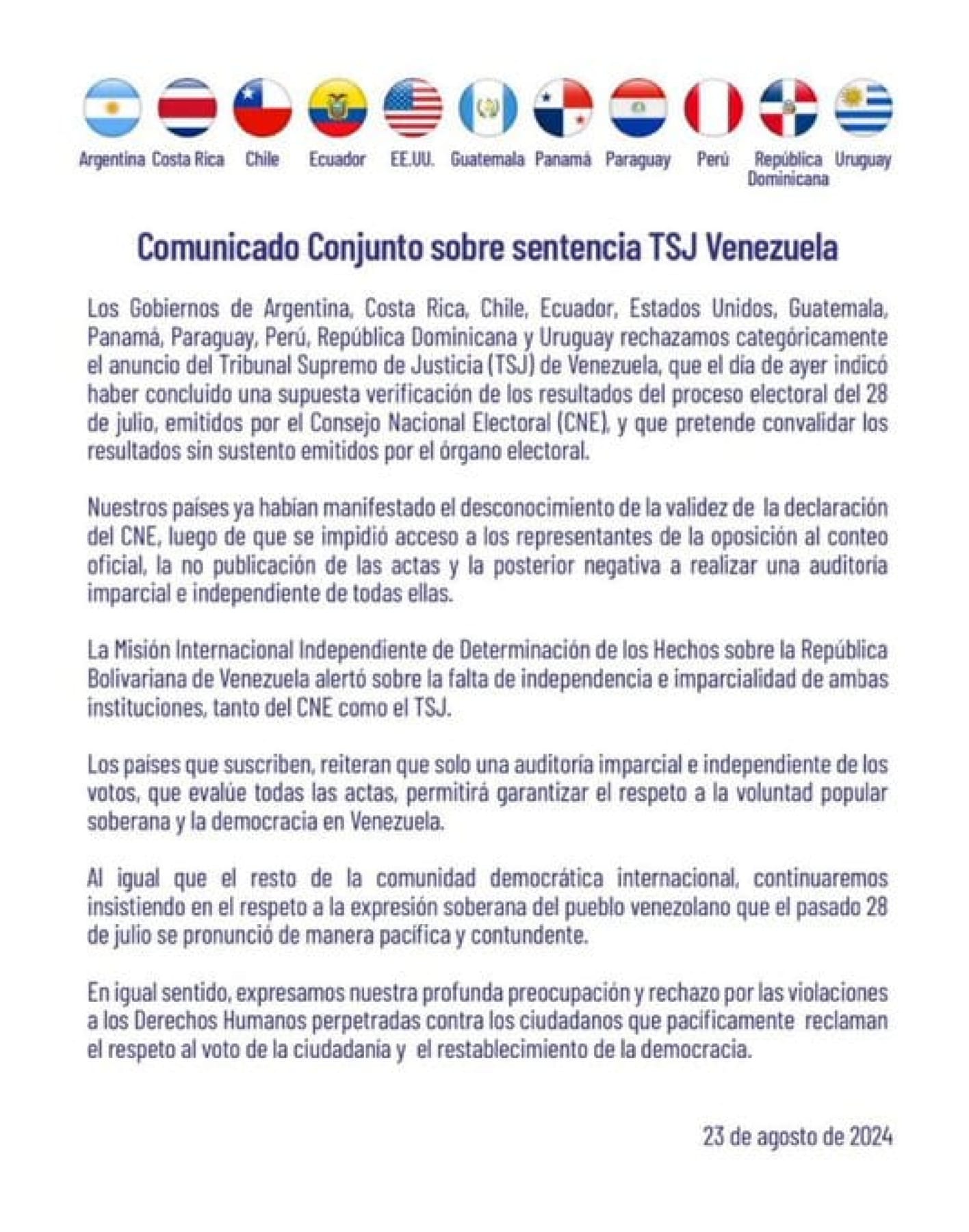 En cambio, 10 países latinoamericanos y Estados Unidos emitieron este viernes un comunicado conjunto en el que rechazaron la decisión del TSJ de Venezuela de dar el triunfo a Maduro en las elecciones del pasado 28 de julio.