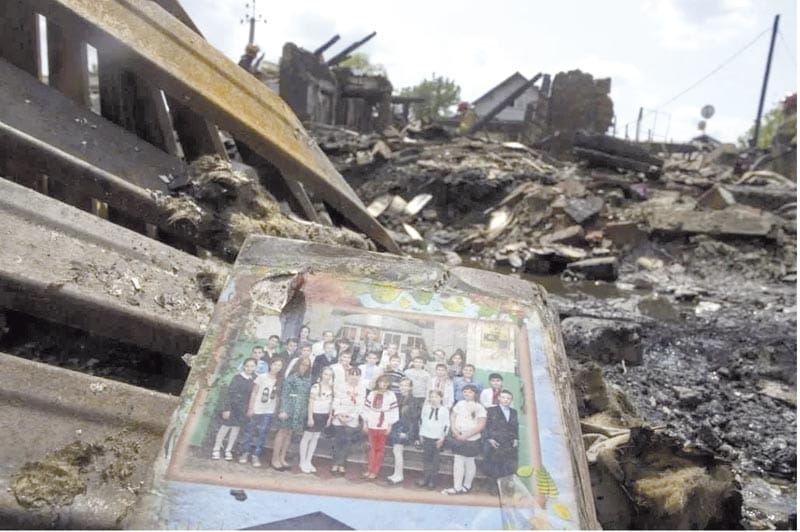 Los bomberos trabajaron entre los escombros carbonizados y extinguieron los restos de un incendio que envolvió la casa de los padres de Shyhyda, de la que quedó apenas un esqueleto de ladrillo y juguetes, ropa y un álbum de fotos familiar esparcidos.