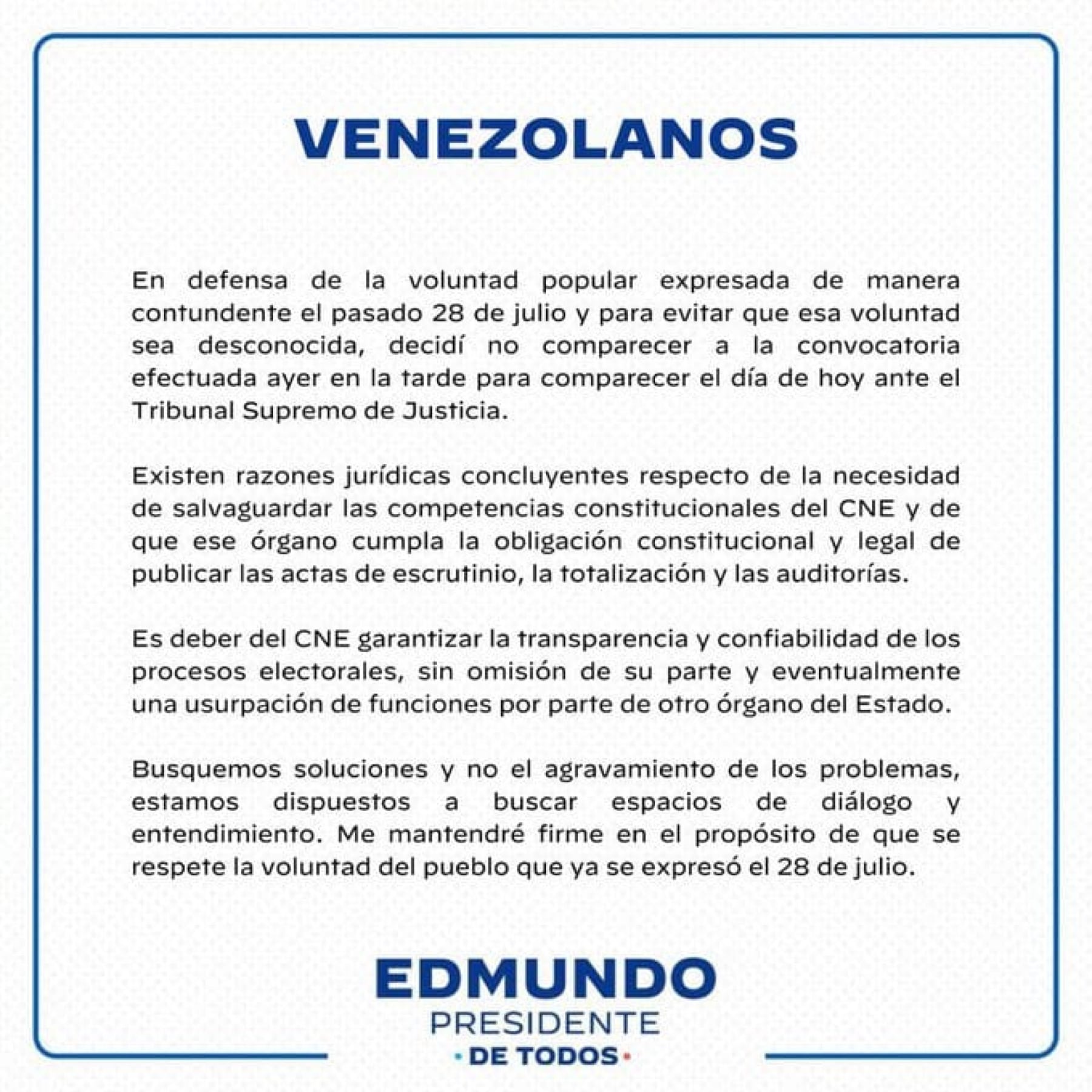"Me voy como vine, sin saber exactamente de qué se trata esto, pero desde acá ratifico mi compromiso firme con la Constitución de la República Bolivariana de Venezuela, con la paz en nuestro país. Ratifico mi compromiso con la voluntad popular expresada el 28 de julio", ha zanjado.