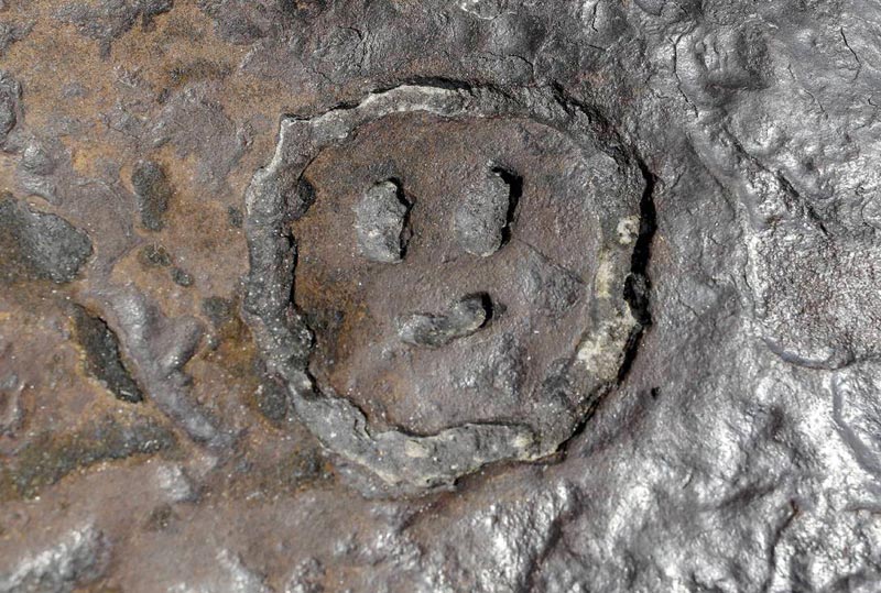 En su mayoría, los grabados remiten a rostros humanos, algunos de forma rectangular y otros de forma ovalada, con sonrisas o gestos más adustos.