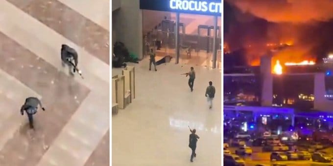 Momento en que los terroristas abrían fuego dentro del recinto atacado en Moscú, Rusia.