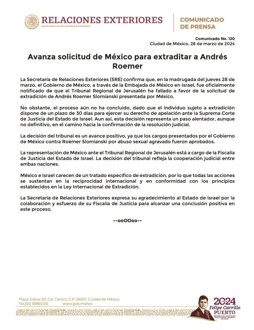 En enero pasado se informó que Roemer, acusado de abuso sexual por más de 60 mujeres, continuaría su proceso de extradición en prisión domiciliaria después de estar en prisión desde octubre del año pasado, cuando las autoridades israelíes lo aprehendieron después de dos años de “libertad” en aquel país.
