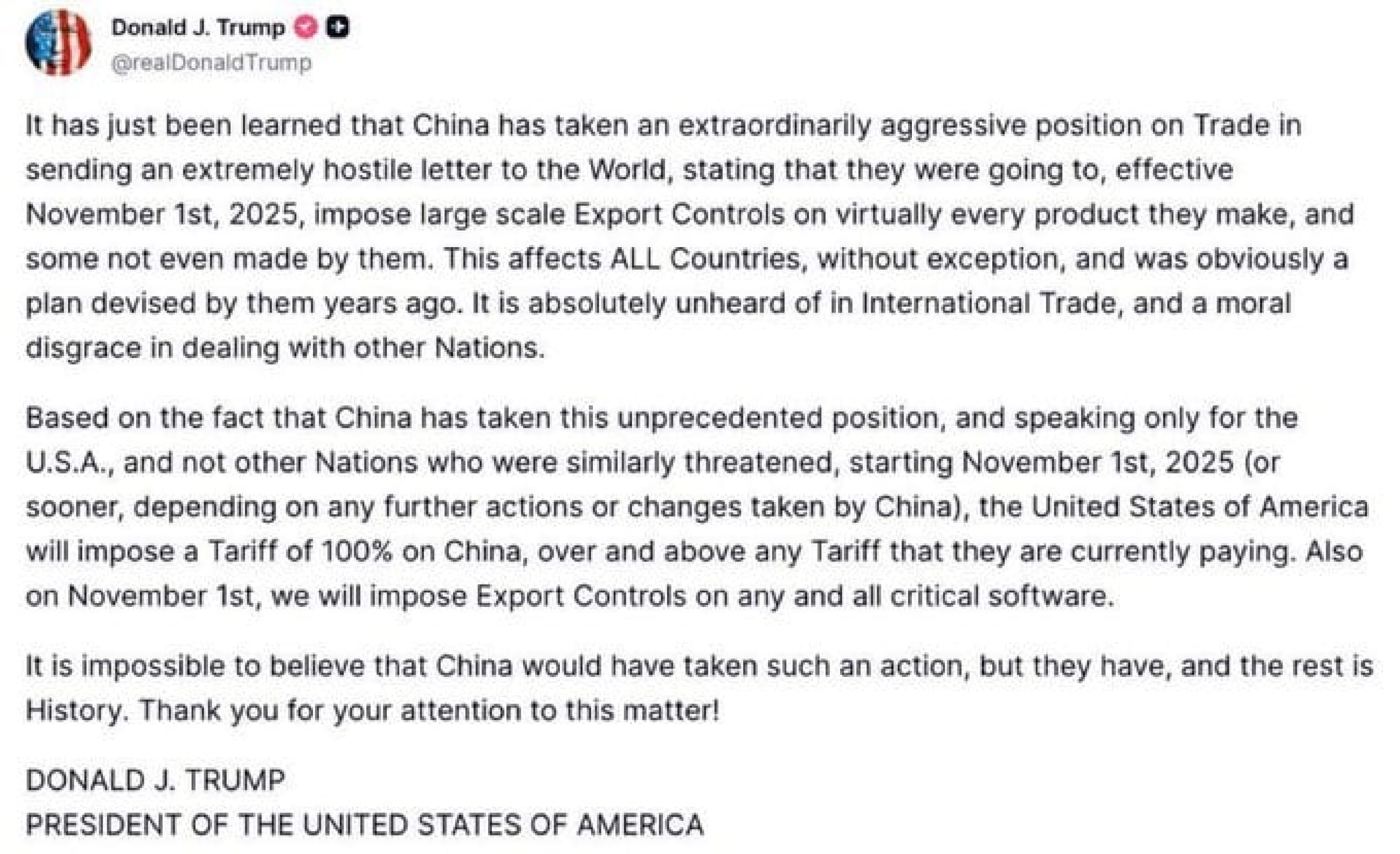"Se acaba de conocer que China ha adoptado una posición extraordinariamente agresiva sobre el comercio, con el envío de una carta extremadamente hostil al mundo, declarando que a partir del 1 de noviembre de 2025 iban a imponer controles de exportación a gran escala sobre prácticamente todos los productos que fabrican, e incluso algunos que ni siquiera fabrican", aseguró el Presidente.