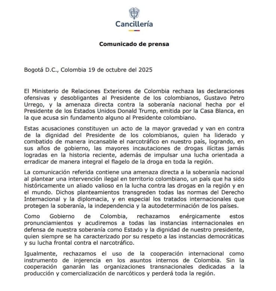 Solo horas antes de la declaración de Trump, Petro había acusado al Ejecutivo estadounidense de haber cometido "un asesinato" en aguas colombianas, en referencia al ataque del jueves contra una embarcación "narcoterrorista" que acabó con la vida de un pescador colombiano, y exigió a la Casa Blanca que rinda cuentas en relación a este suceso.