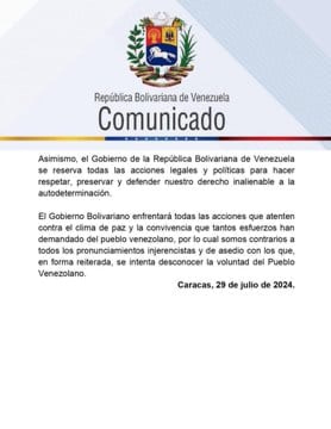 "Somos contrarios a todos los pronunciamientos injerencistas y de asedio con los que, en forma reiterada, se intenta desconocer la voluntad del Pueblo Venezolano", agrega el comunicado.