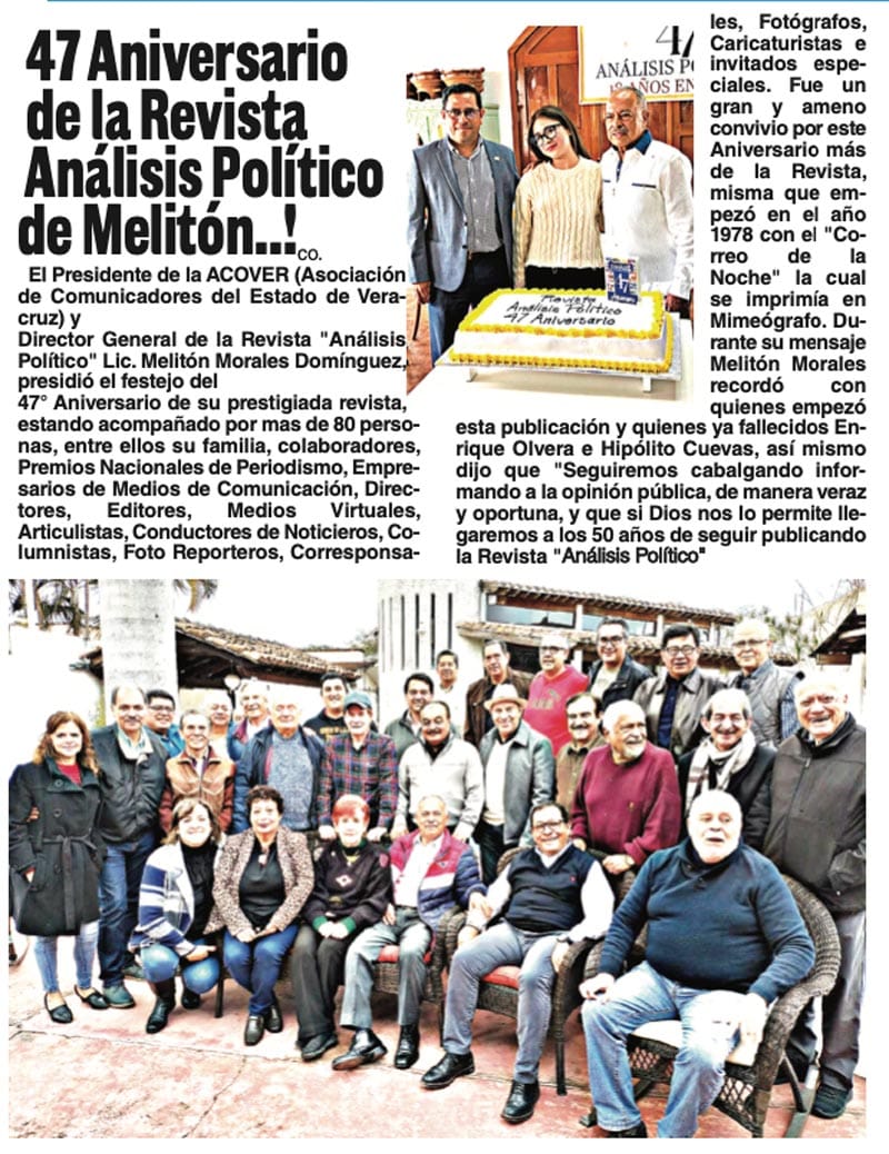 El Presidente de la ACOVER (Asociación de Comunicadores del Estado de Vera-cruz) y Director General de la Revista "Análisis Político" Lic. Melitón Morales Domínguez, presidió el festejo del 47° Aniversario de su prestigiada revista, estando acompañado...
