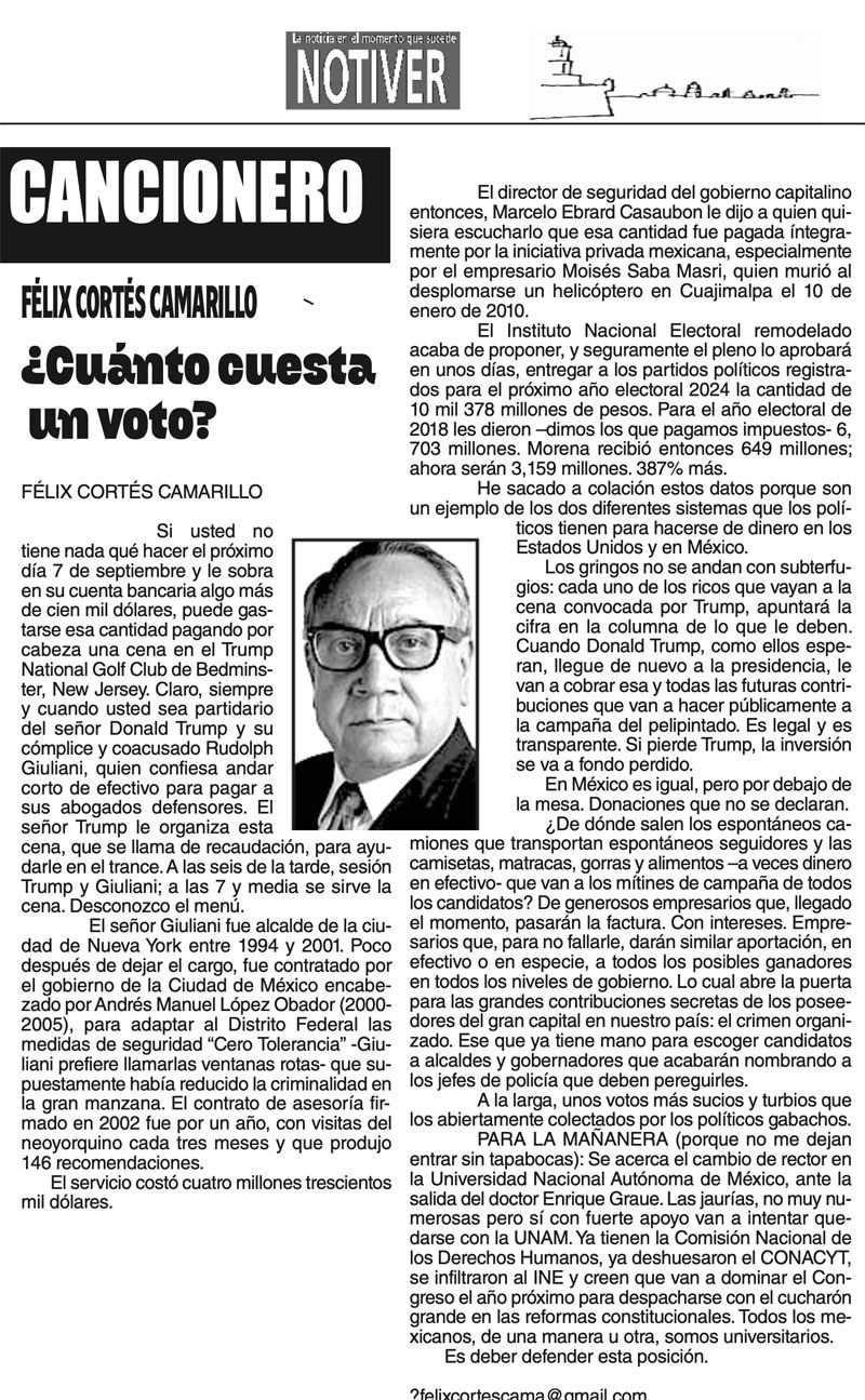 LAS COLUMNAS CANCIONERO ¿CUÁNTO CUESTA UN VOTO? 24 agosto 2023 Más Noticias TEXTO IRREVERENTE | HISTORIAS NECESARIAS - “Cuando Woody tenía 2 años en la guardería les dijeron a sus padres que algo estaba mal, no respondía a las instrucciones básicas. Las pruebas demostraron que era autista grave”. Luego “los médicos… A MIL POR HORA | - **Grandes ilusiones **Peores políticos **Empleos en Veracruz **En misión periodística A MIL POR HORA | - **Historia de 5 casadas **Lucha vs demonios **Dedazo Porfirista **El fut como el SIDA TEXTO IRREVERENTE | NO ES CÁNDIDA - La conversación pública en Veracruz se puso sino interesante al menos contestataria. Los que saben del asunto dividen a la conversación pública en tres espacios principales -no los únicos, pero sí los… ACERTIJOS | LAS PRIMAVERAS CANTORAS - Tengo un jardín bien cuidado, diario lo espío y el jardinero que es de La Perla, Joel, como si fuera de Versalles, lo tiene rechinando de limpio. Hace años me ha dado por darles de comer, antes les tiraba… CANCIONERO | LA TERMINOLOGÍA - En el principio era el Verbo, y el Verbo era Dios.Y el Verbo era con Dios. Lo sigue siendo: las cosas existen dependiendo de nuestra capacidad de darles nombre. La comunicación no existiría sin la convención de que… SIN TACTO | MÁS DE ZEPETA - Un amigo que gravita en el ámbito de Morena se comunica conmigo y me dice que le pareció apegado a la realidad política lo que publiqué en el “Sin tacto” de ayer sobre la suerte previsible de Esteban Ramírez Zepeta y su… CANCIONERO | EUTANASIA - Yo no tengo particular afecto por los animales llamados de compañía o mascotas, con las que seres solitarios procuran agenciarse afectos mediante el truco del perrito en el parque. Confieso que… A MIL POR HORA | - **Huérfanos mil niños **Hablar mal de Veracruz **Mesianismo jarocho **Fidel Castro en el café... SIN TACTO | SIGUE ZEPETA - En un despido que sigue el canon instaurado por la presidenta Claudia Sheinbaum, la dirigente nacional de Morena, Luisa María Alcalde Luján, fue invitada a ocupar la consejería jurídica de la Presidencia de la...
