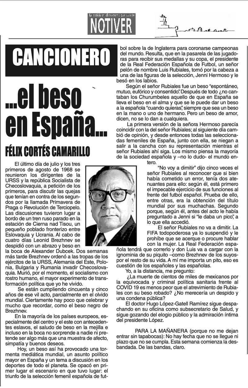 LAS COLUMNAS CANCIONERO ...EL BESO EN ESPAÑA... 28 agosto 2023 Más Noticias CANCIONERO | 1938, OTRA VEZ - Me sorprende la ligereza con la que algunos analistas mexicanos han juzgado el discurso del miércoles por la noche del presidente Donald Trump, y la implícita amenaza de acciones militares... TEXTO IRREVERENTE | A LA PUERTA - Un escándalo de corrupción le estalló en su puerta al hidalguense Ricardo Ahued: el "cartel inmobiliario" en el que están involucrados jueces, notarios, empresarios y funcionarios... A MIL POR HORA | - **Tener miedo **Vivir con miedo **Cambios en Xalapa **Feliz con Alexa... LAS COSAS COMO SON | - ME PUSE A CHIFLAR... ACERTIJOS | NO TENGÁIS MIEDO - Todos los católicos y no católicos, recordamos las primeras palabras de Juan Pablo Segundo, cuando fue entronizado Papa y salió al balcón del Vaticano, donde ellos suelen... MIRADOR | - Los espectros que vagan en la noche por los aposentos de la casona del Potrero piensan que yo también soy un espectro, y me tratan con familiaridad. Doña Lucita de la Peña y Dávila... A MIL POR HORA | - **Una mujer tóxica **Marino asesinado **Julissa deslumbrante **Político incómodo... CANCIONERO | LAS AGUAS MEDIAS - Lo que menos me gusta de la modernidad es que cada vez me entero de más cosas ingratas. Viendo las noticias en las estaciones de televisión los Estados Unidos, especialmente… TEXTO IRREVERENTE | FINAL KÁRMICO - Hace cuatro años, los alcaldes electos de Fortín de las Flores, Córdoba y Medellín de Bravo, morenistas todos, hicieron campaña e iniciaron sus gobiernos con críticas, descalificaciones... SIN TACTO | BIBI EN PUENTE NACIONAL - Por primera vez, Movimiento Ciudadano va a gobernar el municipio de Puente Nacional, aunque será la tercera ocasión en que una mujer lidera la comuna: Bibiana Báez…