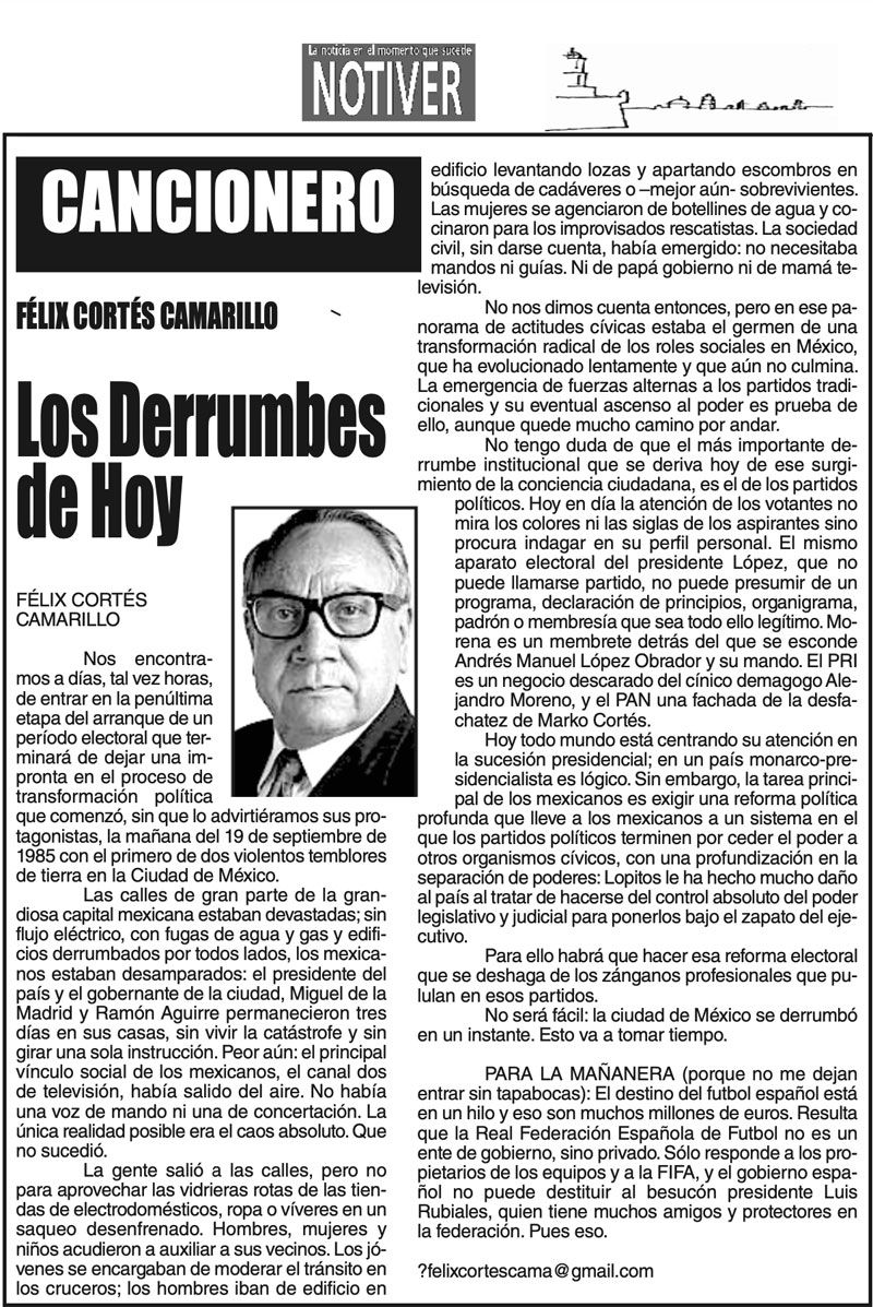 LAS COLUMNAS CANCIONERO... LOS DERRUMBES DE HOY... 30 agosto 2023 Más Noticias A MIL POR HORA | - **Una mujer tóxica **Marino asesinado **Julissa deslumbrante **Político incómodo... CANCIONERO | LAS AGUAS MEDIAS - Lo que menos me gusta de la modernidad es que cada vez me entero de más cosas ingratas. Viendo las noticias en las estaciones de televisión los Estados Unidos, especialmente… TEXTO IRREVERENTE | FINAL KÁRMICO - Hace cuatro años, los alcaldes electos de Fortín de las Flores, Córdoba y Medellín de Bravo, morenistas todos, hicieron campaña e iniciaron sus gobiernos con críticas, descalificaciones... SIN TACTO | BIBI EN PUENTE NACIONAL - Por primera vez, Movimiento Ciudadano va a gobernar el municipio de Puente Nacional, aunque será la tercera ocasión en que una mujer lidera la comuna: Bibiana Báez… ACERTIJOS | LA GRAN JUDY GARLANDO - Vi también la vida de la gran Judy Garland. Madre de otra grande, Liza Minelli. Que ganó Globo de Oro. La revelación, Renée Zellweger, que interpreta a aquella gran diva que tuvo niñez... TEXTO IRREVERENTE | POLVOS Y LODOS - A dos meses de las inundaciones en la región norte de Veracruz no solo quedan polvos de aquellos lodos sino el fango mismo, tanto el bioactivo como el político que... A MIL POR HORA | - **Remedios caseros **Milagrosas hierbitas **Narcomafias en E.U. **Palestina en México... LAS COSAS COMO SON - CUIDEMOS LA VIDA... ACERTIJOS | EL RETORNO DE DANTE - Dante Delgado Rannauro, alvaradeño por la gracia del nacimiento y cordobés por la gracia del acomodamiento, ha retornado a la política… CANCIONERO | PROHIBIDO PROHIBIR - Dos noticias, producto de las vísceras irracionales de sus instigadores, coincidieron en el tiempo en estos días. La primera fue la aprobación de los corderitos legisladores del dizque honorable…