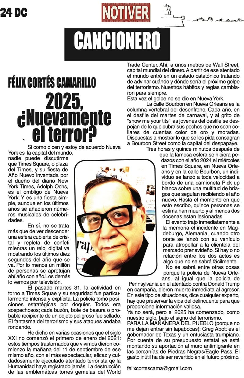 CANCIONERO | 2025, ¿NUEVAMENTE EL TERROR? - Si como dicen y estoy de acuerdo Nueva York es la capital del mundo, nadie puede discutirme que Times Square, o plaza del Times, y su fiesta de Año Nuevo inventada por el dueño...