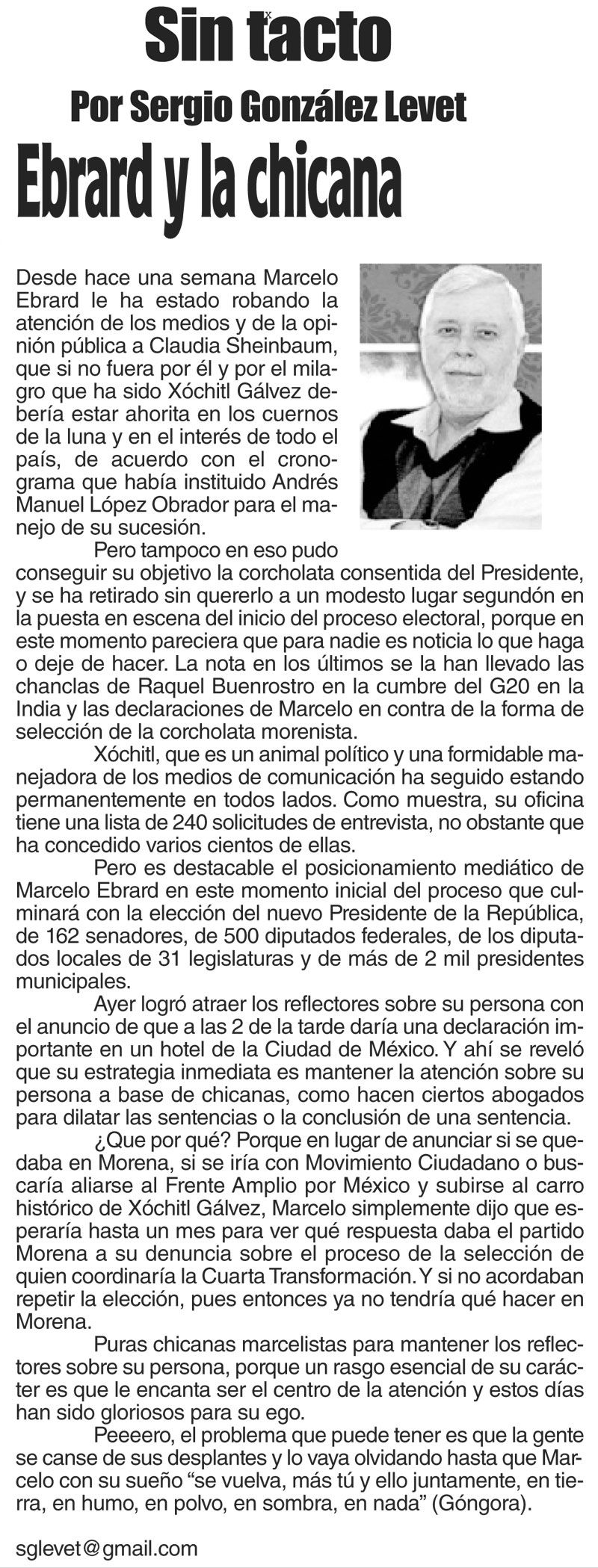 LAS COLUMNAS SIN TACTO EBRARD Y LA CHICANA... 12 septiembre 2023 Más Noticias LAS COSAS COMO SON | - MAS QUE UN DIARIO... TEXTO IRREVERENTE | LE VA A 'ECHAR GANITAS' - Al parecer, el asunto es 'chimoltrufiar' o sea lo mismo decir una cosa que otra. En marzo, el gobierno estatal informó que el programa de rehabilitación de carreteras y caminos conocido como "Bachetón"... ACERTIJOS | EL QUINTO PARTIDO - En la historia de los mundiales, México nunca ha jugado el quinto partido fuera de casa. Lo más que hemos alcanzado es el cuarto juego y de allí nos mandan a casa… A MIL POR HORA | - **Un matrimonio feliz **Apocalipsis jarocho **La isla de los pedófilos **“Amor con amor se paga”... A MIL POR HORA | - **Chicas más guapas **Días revolcados **Fascinantes artistas **Academia de Ególatras... CANCIONERO | EL PAN Y EL LLORO - Nada es accidental en la política. Este fin de semana, la señora presidente con A de patria tendrá una magna concentración de sus seguidores para celebrar el aniversario... TEXTO IRREVERENTE | ENNOCHEBUENADOS - La mercadotecnia adelanta todo y, ni modo, hay que lidiar con eso. Cuando todavía no acababa noviembre ya se vendían productos navideños y ahora mismo por doquiera se ven locales adornados con ese motivo... SIN TACTO | LAS VÍSPERAS - ¿Se acuerda la memorable lectora? ¿Recuerda el memorioso lector?: “Ya va llegando diciembre y sus posadas. Se va acercando ya también la Navidad. El año nuevo... LAS COSAS COMO SON - VAYA CINISMO... TEXTO IRREVERENTE | AÑO BUENO, AÑO MALO - El 2024 fue un año de suerte y abundancia. Este 2025 ha corrido en su contra con infortunio político y mediático. ¿‘Annus horribilis’? Tal vez no llega a tanto, pero sí desastroso y confirmatorio de sus...