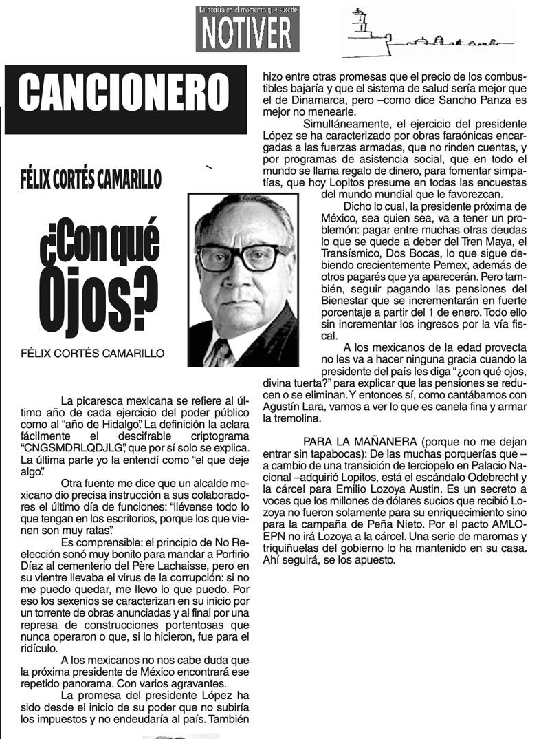 LAS COLUMNAS CANCIONERO ¿CON QUÉ OJOS? 27 septiembre 2023 Más Noticias LAS COSAS COMO SON | - MAS QUE UN DIARIO... TEXTO IRREVERENTE | LE VA A 'ECHAR GANITAS' - Al parecer, el asunto es 'chimoltrufiar' o sea lo mismo decir una cosa que otra. En marzo, el gobierno estatal informó que el programa de rehabilitación de carreteras y caminos conocido como "Bachetón"... ACERTIJOS | EL QUINTO PARTIDO - En la historia de los mundiales, México nunca ha jugado el quinto partido fuera de casa. Lo más que hemos alcanzado es el cuarto juego y de allí nos mandan a casa… A MIL POR HORA | - **Un matrimonio feliz **Apocalipsis jarocho **La isla de los pedófilos **“Amor con amor se paga”... A MIL POR HORA | - **Chicas más guapas **Días revolcados **Fascinantes artistas **Academia de Ególatras... CANCIONERO | EL PAN Y EL LLORO - Nada es accidental en la política. Este fin de semana, la señora presidente con A de patria tendrá una magna concentración de sus seguidores para celebrar el aniversario... TEXTO IRREVERENTE | ENNOCHEBUENADOS - La mercadotecnia adelanta todo y, ni modo, hay que lidiar con eso. Cuando todavía no acababa noviembre ya se vendían productos navideños y ahora mismo por doquiera se ven locales adornados con ese motivo... SIN TACTO | LAS VÍSPERAS - ¿Se acuerda la memorable lectora? ¿Recuerda el memorioso lector?: “Ya va llegando diciembre y sus posadas. Se va acercando ya también la Navidad. El año nuevo... LAS COSAS COMO SON - VAYA CINISMO... TEXTO IRREVERENTE | AÑO BUENO, AÑO MALO - El 2024 fue un año de suerte y abundancia. Este 2025 ha corrido en su contra con infortunio político y mediático. ¿‘Annus horribilis’? Tal vez no llega a tanto, pero sí desastroso y confirmatorio de sus...