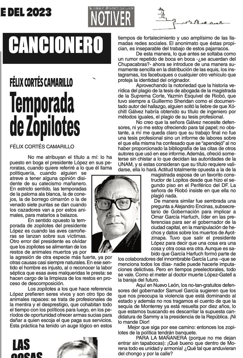 LAS COLUMNAS CANCIONERO TEMPORADA DE ZOPILOTES... 29 septiembre 2023 Más Noticias TEXTO IRREVERENTE | UN ARTE ETERNO - Envejecer haciendo periodismo no es sinónimo de obsolescencia ni de ser retardatario. La llamada ‘vieja guardia’ de la reporteada y del análisis periodístico... DIARIO DE UN REPORTERO | Y TODO ¿PARA QUÉ? - Tres días estuvo cerrado el centro de Xalapa porque se preparaba el escenario para el primer informe de la gobernadora Rocío Nahle. El tránsito... ACERTIJOS | NACEN LOS RIVALES EN FIFA - Es la mañana del sorteo de FIFA, en Washington, que amanece con un frio del carajo a 2 grados bajo cero y con caída de nieve. Llegan al Kennedy Center… A MIL POR HORA | - **5 películas icónicas **Seniles: bailar en casa **Marilyn y Chanel 5 **Sabroso quesito fundido... LAS COSAS COMO SON | - MAS QUE UN DIARIO... TEXTO IRREVERENTE | LE VA A 'ECHAR GANITAS' - Al parecer, el asunto es 'chimoltrufiar' o sea lo mismo decir una cosa que otra. En marzo, el gobierno estatal informó que el programa de rehabilitación de carreteras y caminos conocido como "Bachetón"... ACERTIJOS | EL QUINTO PARTIDO - En la historia de los mundiales, México nunca ha jugado el quinto partido fuera de casa. Lo más que hemos alcanzado es el cuarto juego y de allí nos mandan a casa… A MIL POR HORA | - **Un matrimonio feliz **Apocalipsis jarocho **La isla de los pedófilos **“Amor con amor se paga”... A MIL POR HORA | - **Chicas más guapas **Días revolcados **Fascinantes artistas **Academia de Ególatras... CANCIONERO | EL PAN Y EL LLORO - Nada es accidental en la política. Este fin de semana, la señora presidente con A de patria tendrá una magna concentración de sus seguidores para celebrar el aniversario...