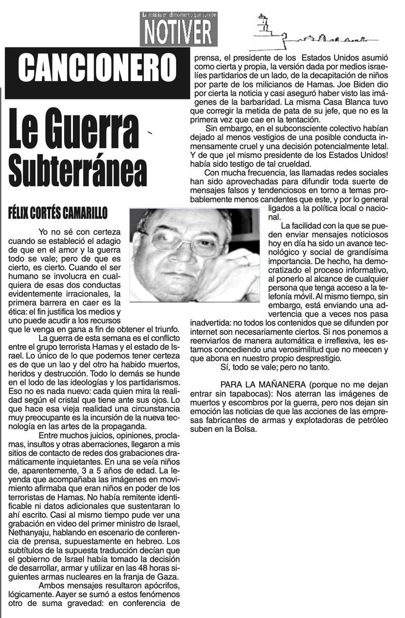 LAS COLUMNAS CANCIONERO - LA GUERRA SUBTERRÁNEA LA GUERRA SUBTERRÁNEA... 13 octubre 2023 Más Noticias LAS COSAS COMO SON | - MAS QUE UN DIARIO... TEXTO IRREVERENTE | LE VA A 'ECHAR GANITAS' - Al parecer, el asunto es 'chimoltrufiar' o sea lo mismo decir una cosa que otra. En marzo, el gobierno estatal informó que el programa de rehabilitación de carreteras y caminos conocido como "Bachetón"... ACERTIJOS | EL QUINTO PARTIDO - En la historia de los mundiales, México nunca ha jugado el quinto partido fuera de casa. Lo más que hemos alcanzado es el cuarto juego y de allí nos mandan a casa… A MIL POR HORA | - **Un matrimonio feliz **Apocalipsis jarocho **La isla de los pedófilos **“Amor con amor se paga”... A MIL POR HORA | - **Chicas más guapas **Días revolcados **Fascinantes artistas **Academia de Ególatras... CANCIONERO | EL PAN Y EL LLORO - Nada es accidental en la política. Este fin de semana, la señora presidente con A de patria tendrá una magna concentración de sus seguidores para celebrar el aniversario... TEXTO IRREVERENTE | ENNOCHEBUENADOS - La mercadotecnia adelanta todo y, ni modo, hay que lidiar con eso. Cuando todavía no acababa noviembre ya se vendían productos navideños y ahora mismo por doquiera se ven locales adornados con ese motivo... SIN TACTO | LAS VÍSPERAS - ¿Se acuerda la memorable lectora? ¿Recuerda el memorioso lector?: “Ya va llegando diciembre y sus posadas. Se va acercando ya también la Navidad. El año nuevo... LAS COSAS COMO SON - VAYA CINISMO... TEXTO IRREVERENTE | AÑO BUENO, AÑO MALO - El 2024 fue un año de suerte y abundancia. Este 2025 ha corrido en su contra con infortunio político y mediático. ¿‘Annus horribilis’? Tal vez no llega a tanto, pero sí desastroso y confirmatorio de sus...