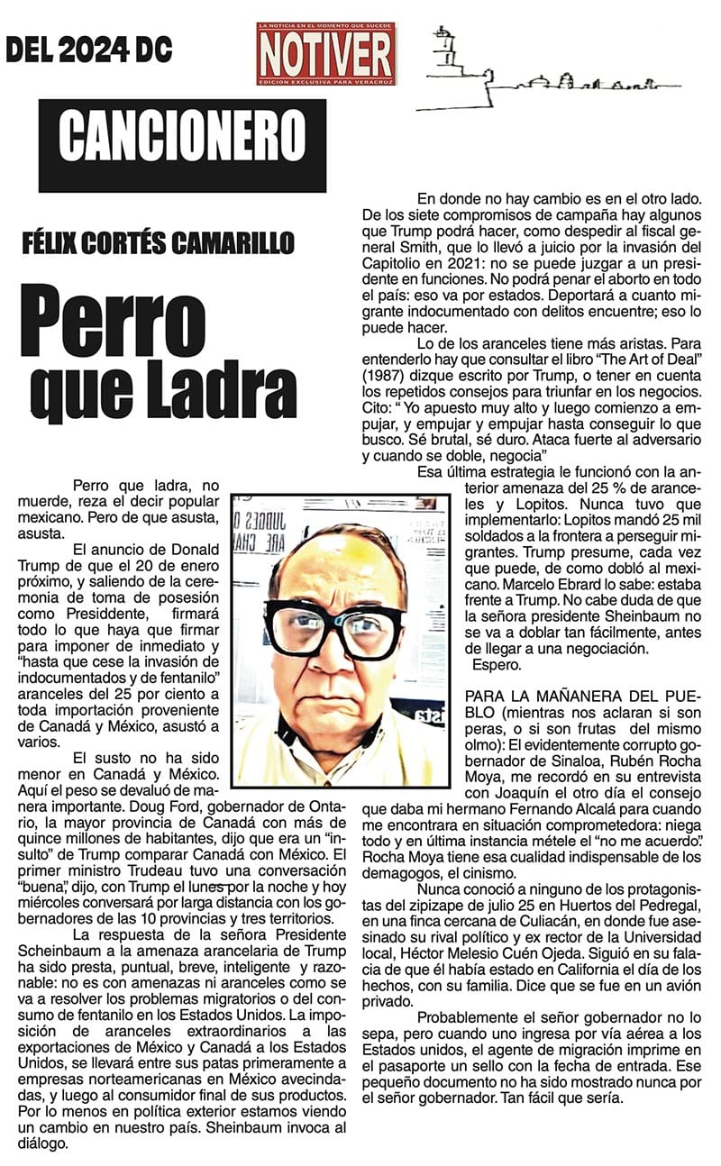CANCIONERO | PERRO QUE LADRA - Perro que ladra, no muerde, reza el decir popular mexicano. Pero de que asusta, asusta. El anuncio de Donald Trump de que el 20 de enero próximo, y saliendo de la ceremonia...