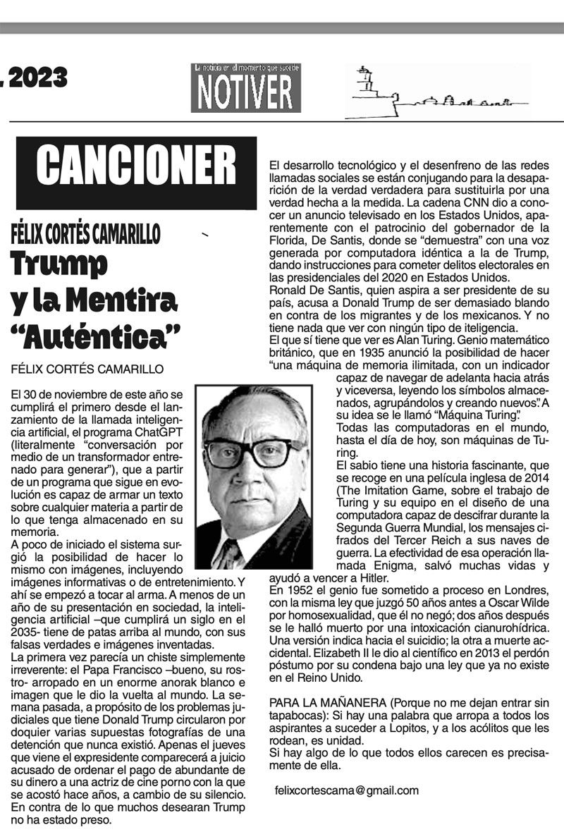 LAS COLUMNAS CANCIONERO TRUMP Y LA MENTIRA ¨AUTENTICA¨... 21 agosto 2023 Más Noticias LAS COSAS COMO SON | - MAS QUE UN DIARIO... TEXTO IRREVERENTE | LE VA A 'ECHAR GANITAS' - Al parecer, el asunto es 'chimoltrufiar' o sea lo mismo decir una cosa que otra. En marzo, el gobierno estatal informó que el programa de rehabilitación de carreteras y caminos conocido como "Bachetón"... ACERTIJOS | EL QUINTO PARTIDO - En la historia de los mundiales, México nunca ha jugado el quinto partido fuera de casa. Lo más que hemos alcanzado es el cuarto juego y de allí nos mandan a casa… A MIL POR HORA | - **Un matrimonio feliz **Apocalipsis jarocho **La isla de los pedófilos **“Amor con amor se paga”... A MIL POR HORA | - **Chicas más guapas **Días revolcados **Fascinantes artistas **Academia de Ególatras... CANCIONERO | EL PAN Y EL LLORO - Nada es accidental en la política. Este fin de semana, la señora presidente con A de patria tendrá una magna concentración de sus seguidores para celebrar el aniversario... TEXTO IRREVERENTE | ENNOCHEBUENADOS - La mercadotecnia adelanta todo y, ni modo, hay que lidiar con eso. Cuando todavía no acababa noviembre ya se vendían productos navideños y ahora mismo por doquiera se ven locales adornados con ese motivo... SIN TACTO | LAS VÍSPERAS - ¿Se acuerda la memorable lectora? ¿Recuerda el memorioso lector?: “Ya va llegando diciembre y sus posadas. Se va acercando ya también la Navidad. El año nuevo... LAS COSAS COMO SON - VAYA CINISMO... TEXTO IRREVERENTE | AÑO BUENO, AÑO MALO - El 2024 fue un año de suerte y abundancia. Este 2025 ha corrido en su contra con infortunio político y mediático. ¿‘Annus horribilis’? Tal vez no llega a tanto, pero sí desastroso y confirmatorio de sus...