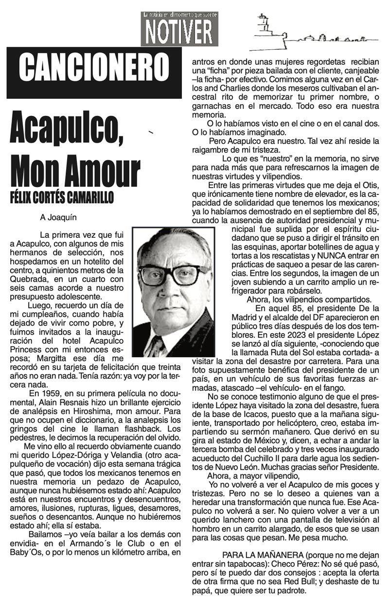 LAS COLUMNAS CANCIONERO -ACAPULCO MON AMOUR ACAPULCO MON AMOUR... 30 octubre 2023 Más Noticias LAS COSAS COMO SON | - MAS QUE UN DIARIO... TEXTO IRREVERENTE | LE VA A 'ECHAR GANITAS' - Al parecer, el asunto es 'chimoltrufiar' o sea lo mismo decir una cosa que otra. En marzo, el gobierno estatal informó que el programa de rehabilitación de carreteras y caminos conocido como "Bachetón"... ACERTIJOS | EL QUINTO PARTIDO - En la historia de los mundiales, México nunca ha jugado el quinto partido fuera de casa. Lo más que hemos alcanzado es el cuarto juego y de allí nos mandan a casa… A MIL POR HORA | - **Un matrimonio feliz **Apocalipsis jarocho **La isla de los pedófilos **“Amor con amor se paga”... A MIL POR HORA | - **Chicas más guapas **Días revolcados **Fascinantes artistas **Academia de Ególatras... CANCIONERO | EL PAN Y EL LLORO - Nada es accidental en la política. Este fin de semana, la señora presidente con A de patria tendrá una magna concentración de sus seguidores para celebrar el aniversario... TEXTO IRREVERENTE | ENNOCHEBUENADOS - La mercadotecnia adelanta todo y, ni modo, hay que lidiar con eso. Cuando todavía no acababa noviembre ya se vendían productos navideños y ahora mismo por doquiera se ven locales adornados con ese motivo... SIN TACTO | LAS VÍSPERAS - ¿Se acuerda la memorable lectora? ¿Recuerda el memorioso lector?: “Ya va llegando diciembre y sus posadas. Se va acercando ya también la Navidad. El año nuevo... LAS COSAS COMO SON - VAYA CINISMO... TEXTO IRREVERENTE | AÑO BUENO, AÑO MALO - El 2024 fue un año de suerte y abundancia. Este 2025 ha corrido en su contra con infortunio político y mediático. ¿‘Annus horribilis’? Tal vez no llega a tanto, pero sí desastroso y confirmatorio de sus...