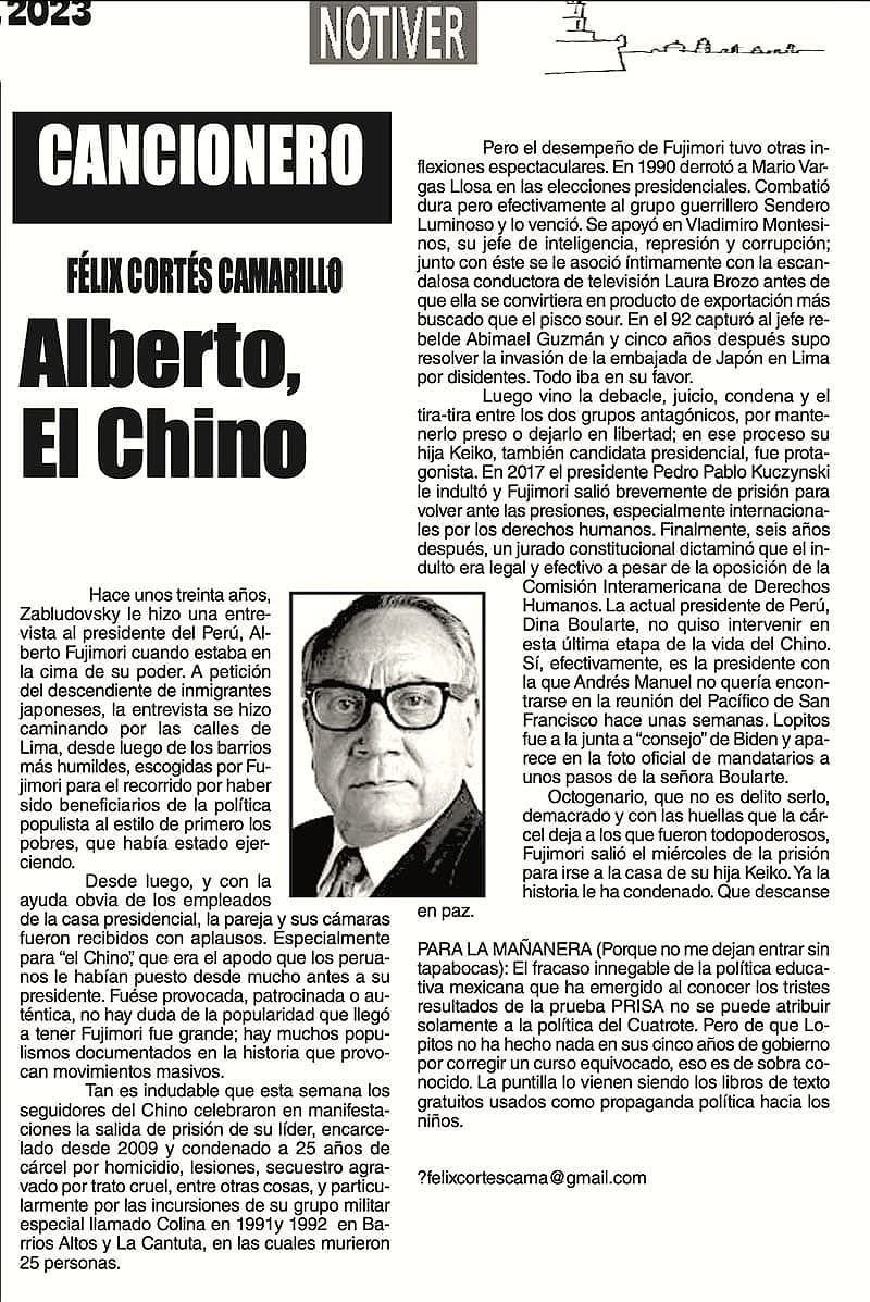LAS COLUMNAS CANCIONERO -ALBERTO, EL CHINO ALBERTO, EL CHINO... 8 diciembre 2023 Más Noticias A MIL POR HORA | - **Audiencia Ciudadana **Ir a la gente **Estilo de gobernar **Maryjose 2030 ACERTIJOS | - Hace unos días, convocados por Pablo Delgado Rannauro, empresario, político y alguna vez candidato a la alcaldía de Orizaba, hermano de quien fue uno de los mejores gobernadores de Veracruz, Dante Alfonso Delgado Rannauro, convocó a… SIN TACTO | GRIEGO EN ATENASO EN A - Es verdad que los jubilados del Instituto de Pensiones (IPE) recuerdan con afecto y le tienen gran reconocimiento a la socióloga Daniela Griego Ceballos, porque en 2018 llegó a poner orden a la dependencia… TEXTO IRREVERENTE | REGINA, OTRO AÑO - Para los que se duelen, el tiempo pasa diferente dicen muchos de los que han sido marcados por la tragedia, los sobrevivientes claro, y es muy difícil acostumbrarse al resultado y a la cotidianidad. Y, a… LAS COSAS COMO SON | - QUINIENTOS SIETE AÑOS... TEXTO IRREVERENTE | HISTORIAS NECESARIAS - “Cuando Woody tenía 2 años en la guardería les dijeron a sus padres que algo estaba mal, no respondía a las instrucciones básicas. Las pruebas demostraron que era autista grave”. Luego “los médicos… A MIL POR HORA | - **Grandes ilusiones **Peores políticos **Empleos en Veracruz **En misión periodística A MIL POR HORA | - **Historia de 5 casadas **Lucha vs demonios **Dedazo Porfirista **El fut como el SIDA TEXTO IRREVERENTE | NO ES CÁNDIDA - La conversación pública en Veracruz se puso sino interesante al menos contestataria. Los que saben del asunto dividen a la conversación pública en tres espacios principales -no los únicos, pero sí los… ACERTIJOS | LAS PRIMAVERAS CANTORAS - Tengo un jardín bien cuidado, diario lo espío y el jardinero que es de La Perla, Joel, como si fuera de Versalles, lo tiene rechinando de limpio. Hace años me ha dado por darles de comer, antes les tiraba…