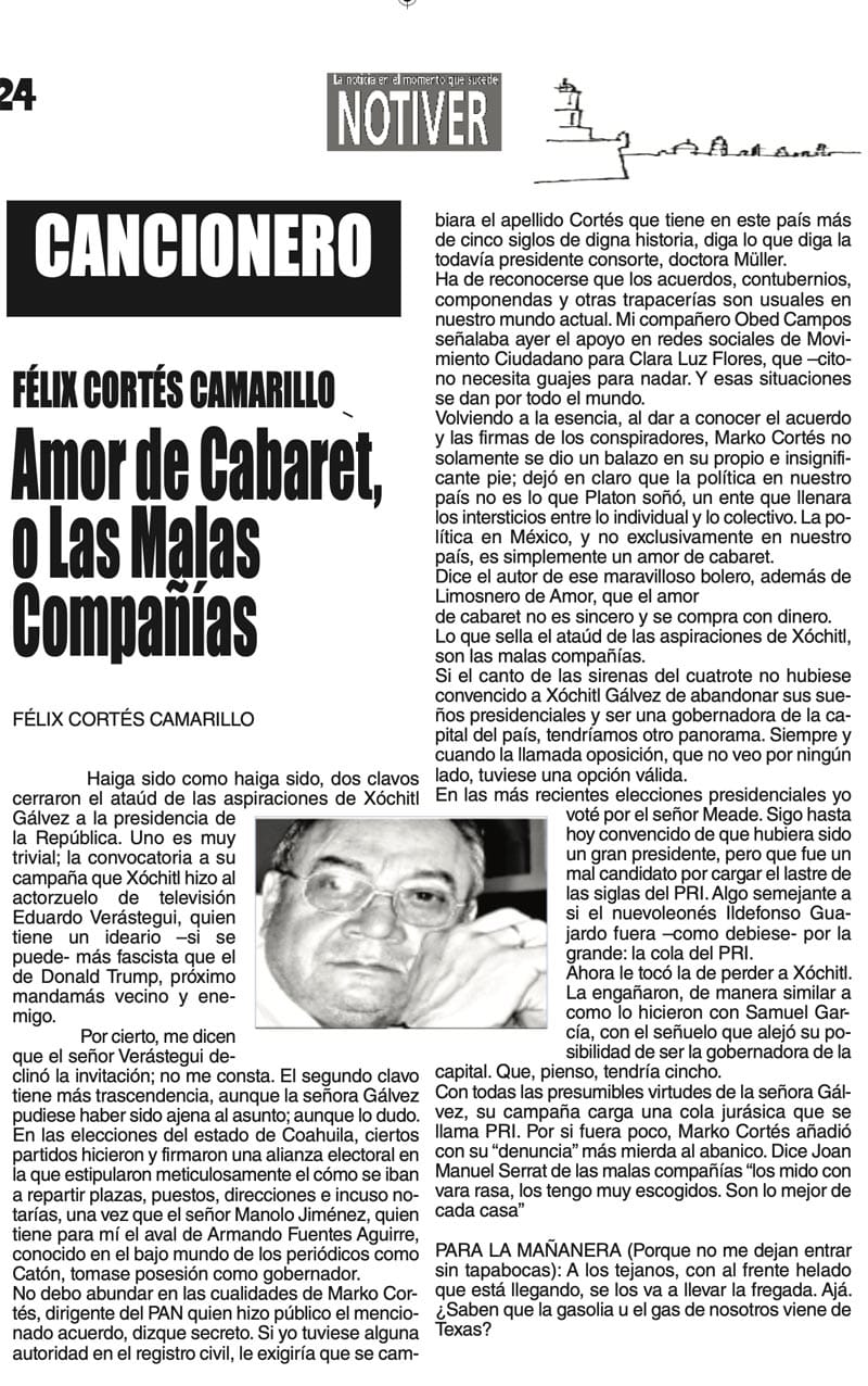 LAS COLUMNAS CANCIONERO -AMOR DE CABARET, O LAS MALAS COMPAÑÍAS... AMOR DE CABARET, O LAS MALAS COMPAÑÍAS... 16 enero 2024 Más Noticias SIN TACTO | ORDEN EN LA LEGISLATURA - Una vez que fueron domados los efluvios principescos de las viudas de Cuitláhuac que consiguieron seguir untadas en la ubre presupuestal en este sexenio, la Legislatura ha proseguido el camino de la buena... A MIL POR HORA | - **Filosofía popular **Frasecitas célebres **Ángel de la guarda **La huella de Nahle... TEXTO IRREVERENTE | BIEN CUMPLIDORA - Nadie, absolutamente nadie, puede acusar al exalcalde de Pánuco, Oscar Guzmán de Paz, de ser un mero fanfarrón pues lo que contaba en las cantinas y comilonas resultó cierto: la gobernante Rocío Nahle “se la... ACERTIJOS | ELEMENTAL MI QUERIDO ROMO - Cuando se desarrollaba la contienda entre AMLO y Anaya y los del PRI y amigos que le acompañaban. La contienda se veía apretada. Ricardo Anaya repuntaba pese al riqui-riquin-canallín-, pero Peña Nieto... CANCIONERO | LA PAZ MÁS FRÁGIL - Noventa minutos antes de que se venciera el plazo perentorio que Donald Trump le había fijado a Irán, para lanzar en su contra una ofensiva devastadora sobre sus puentes y plantas eléctricas, el presidente... TEXTO IRREVERENTE | SIEMPRE FLOTA - “Lo bofo siempre flota”, se dice aunque no es el adagio original ya que se tomó de la física, concretamente del Principio de Arquímedes que estipula que “todo cuerpo total o parcialmente sumergido en un... ACERTIJOS | EL PARIENTE ARQUITECTO - Es un primo muy querido. Hijo del jalapeño arquitecto Hermas Haaz Pavón, hermano de mi padre Enrique. Desde chicos nos tratamos, trato de presumir a la familia pues fue y es un arquitecto renombrado y jubilado… DE MÉDICO, POETA Y…. | EL IMSS NO ES EL ENEMIGO” - "Mientras en redes se lanzan insultos y memes contra el IMSS, en los pasillos del hospital aún suenan los monitores, los gritos de urgencia y el eco de quienes pelean por mantener con vida a desconocidos… CANCIONERO | YA LLEGÓ, YA ESTÁ AQUÍ - Cuál más cuál menos, todos tenemos en estos tiempos un gusanito en la oreja cuando la plática entra en los terrenos de la inteligencia artificial. Hay tantos criterios encontrados sobre esta herramienta, como… SIN TACTO | SOLO Y SÓLO /2 - Decía ayer que la Real Academia Española de la Lengua, fundada en 1713 por el marqués de Villena, ha hecho mucho y poco por el idioma. Mucho, porque ha conseguido parcialmente que nuestra grafía...