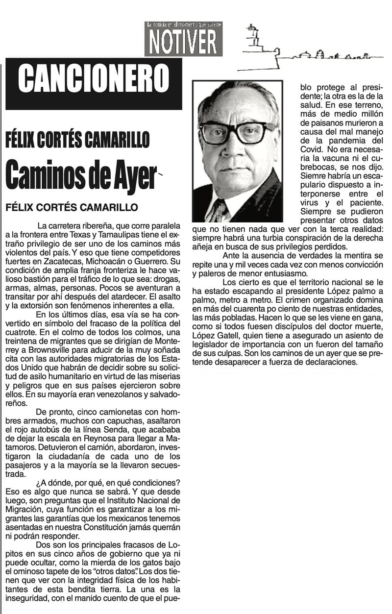 LAS COLUMNAS CANCIONERO - CAMINOS DE AYER CAMINOS DE AYER... 5 enero 2024 Más Noticias ACERTIJOS | LOS 100 AÑOS DE JULIO SCHERER - Julio Scherer García murió en 2015. La unanimidad, esa flor rara, rodeó sus funerales con la corona de la admiración. En estos días cumplió cien años de su nacimiento y la prensa recuperó algo de... A MIL POR HORA | - **Perfil de un mexicano **El jarocho patriota **La lengua más larga **Estilo Porfiriano... SIN TACTO | LA UV DISCRIMINA A JUAN JOSÉ BARRIENTOS - Juan José Barrientos es un ave de tempestades, como corresponde a todo escritor genial. En su larga, larguísima trayectoria literaria ha acumulado estudios y experiencia que se han adjuntado… TEXTO IRREVERENTE | FASCISMO ANTIHUERTISTA - Antes fue deducción, ahora es certeza. Desde el congreso local que dirige Esteban Bautista se financian asambleas y propaganda para denostar al senador Manuel Huerta. Es decir, se utiliza el... CANCIONERO | INTELIGENCIA - No me pidan que sustente la veracidad de lo que voy a escribir enseguida, porque no puedo hacerlo; tampoco voy a proporcionar fuentes de información fidedignas, ni pruebas documentales confiables. No me las pidan... CANCIONERO | CANDIL DE LA CALLE - Ya corrió bastante tinta, inclusive en este espacio, reconociendo la simplemente digna conducta de la señora presidente con A de mujer durante sus muy publicitadas apariciones en su breve visita a Barcelona y... ACERTIJOS | DOS MUJERES. DOS PASIONES - Dos mujeres que piensan diferente y que, quizá estarán en trincheras opositoras. Una ya gobierna un país grande, México, la otra va a ser pronto la presidenta de Venezuela, en cuanto se ponga más quieto aquel... TEXTO IRREVERENTE | EN TRES ACTOS - Primer acto. Miguel Ángel Anaya Castillo, periodista independiente y dueño del portal informativo “Pánuco On Line” incomoda al poder municipal por reportar los abusos de poder y andanas insanas del alcalde… A MIL POR HORA | - **El mundo animal… **Retrato de Veracruz **Jarocho de Jack London **Lo mejor y peor del día... SIN TACTO | LA BRONCA EN SALUD ESTATAL - Son 26 mil trabajadores los que tiene en Veracruz el sector Salud y son ellos mismos los que están en un movimiento activo para exigir sus derechos no cumplidos y que se ponga la atención debida a los servicios...