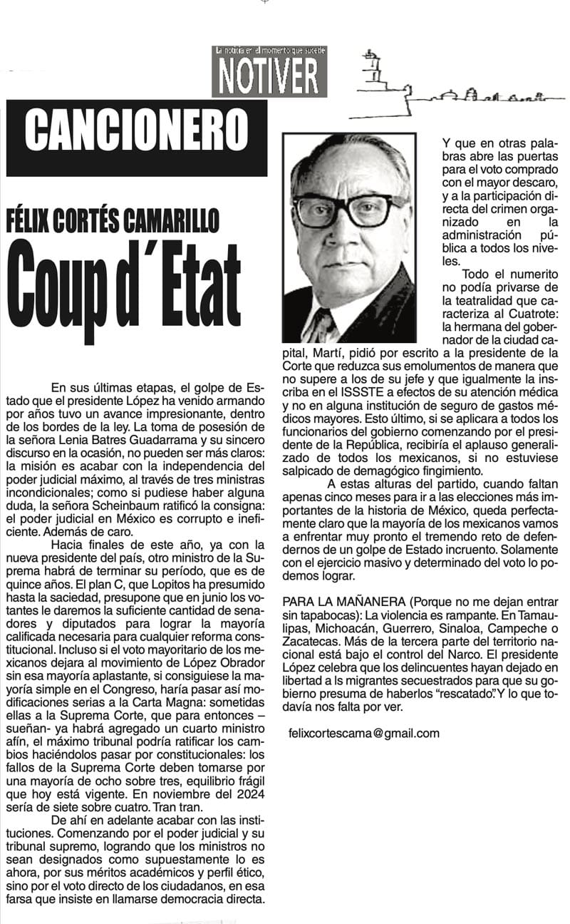 LAS COLUMNAS CANCIONERO - COUP D´ ETAT COUP D´ ETAT... 8 enero 2024 Más Noticias CANCIONERO | EUTANASIA - Yo no tengo particular afecto por los animales llamados de compañía o mascotas, con las que seres solitarios procuran agenciarse afectos mediante el truco del perrito en el parque. Confieso que… A MIL POR HORA | - **Huérfanos mil niños **Hablar mal de Veracruz **Mesianismo jarocho **Fidel Castro en el café... SIN TACTO | SIGUE ZEPETA - En un despido que sigue el canon instaurado por la presidenta Claudia Sheinbaum, la dirigente nacional de Morena, Luisa María Alcalde Luján, fue invitada a ocupar la consejería jurídica de la Presidencia de la... TEXTO IRREVERENTE | ABRAZO FRATERNO - “Dios traerá con Jesús a los que se durmieron en Él” (1 Tesalonicenses 4:13). Desde acá va un abrazo solidario y fraterno para el periodista Luis Velásquez Rivera por la partida de su hermano... ACERTIJOS | LOS TIROTEOS EN LA TELE - Si uno llegara a conocer un nuevo país, suponiendo México, y comenzara a conocerlo y encendiera la tele para revisar el noticiero nocturno, qué bárbaro, pensarían que estamos en un campo de guerra y batalla... ACERTIJOS | LOS 100 AÑOS DE JULIO SCHERER - Julio Scherer García murió en 2015. La unanimidad, esa flor rara, rodeó sus funerales con la corona de la admiración. En estos días cumplió cien años de su nacimiento y la prensa recuperó algo de... A MIL POR HORA | - **Perfil de un mexicano **El jarocho patriota **La lengua más larga **Estilo Porfiriano... SIN TACTO | LA UV DISCRIMINA A JUAN JOSÉ BARRIENTOS - Juan José Barrientos es un ave de tempestades, como corresponde a todo escritor genial. En su larga, larguísima trayectoria literaria ha acumulado estudios y experiencia que se han adjuntado… TEXTO IRREVERENTE | FASCISMO ANTIHUERTISTA - Antes fue deducción, ahora es certeza. Desde el congreso local que dirige Esteban Bautista se financian asambleas y propaganda para denostar al senador Manuel Huerta. Es decir, se utiliza el... CANCIONERO | INTELIGENCIA - No me pidan que sustente la veracidad de lo que voy a escribir enseguida, porque no puedo hacerlo; tampoco voy a proporcionar fuentes de información fidedignas, ni pruebas documentales confiables. No me las pidan...