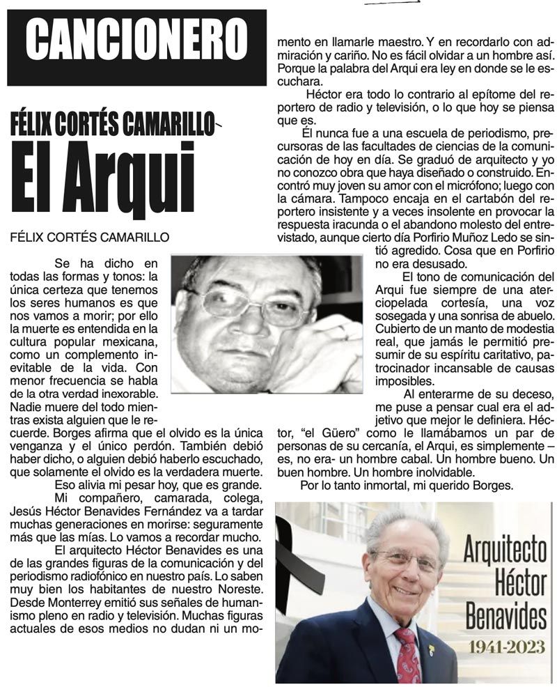LAS COLUMNAS CANCIONERO - EL ARQUI EL ARQUI... 15 noviembre 2023 Más Noticias CANCIONERO | 1938, OTRA VEZ - Me sorprende la ligereza con la que algunos analistas mexicanos han juzgado el discurso del miércoles por la noche del presidente Donald Trump, y la implícita amenaza de acciones militares... TEXTO IRREVERENTE | A LA PUERTA - Un escándalo de corrupción le estalló en su puerta al hidalguense Ricardo Ahued: el "cartel inmobiliario" en el que están involucrados jueces, notarios, empresarios y funcionarios... A MIL POR HORA | - **Tener miedo **Vivir con miedo **Cambios en Xalapa **Feliz con Alexa... LAS COSAS COMO SON | - ME PUSE A CHIFLAR... ACERTIJOS | NO TENGÁIS MIEDO - Todos los católicos y no católicos, recordamos las primeras palabras de Juan Pablo Segundo, cuando fue entronizado Papa y salió al balcón del Vaticano, donde ellos suelen... MIRADOR | - Los espectros que vagan en la noche por los aposentos de la casona del Potrero piensan que yo también soy un espectro, y me tratan con familiaridad. Doña Lucita de la Peña y Dávila... A MIL POR HORA | - **Una mujer tóxica **Marino asesinado **Julissa deslumbrante **Político incómodo... CANCIONERO | LAS AGUAS MEDIAS - Lo que menos me gusta de la modernidad es que cada vez me entero de más cosas ingratas. Viendo las noticias en las estaciones de televisión los Estados Unidos, especialmente… TEXTO IRREVERENTE | FINAL KÁRMICO - Hace cuatro años, los alcaldes electos de Fortín de las Flores, Córdoba y Medellín de Bravo, morenistas todos, hicieron campaña e iniciaron sus gobiernos con críticas, descalificaciones... SIN TACTO | BIBI EN PUENTE NACIONAL - Por primera vez, Movimiento Ciudadano va a gobernar el municipio de Puente Nacional, aunque será la tercera ocasión en que una mujer lidera la comuna: Bibiana Báez…