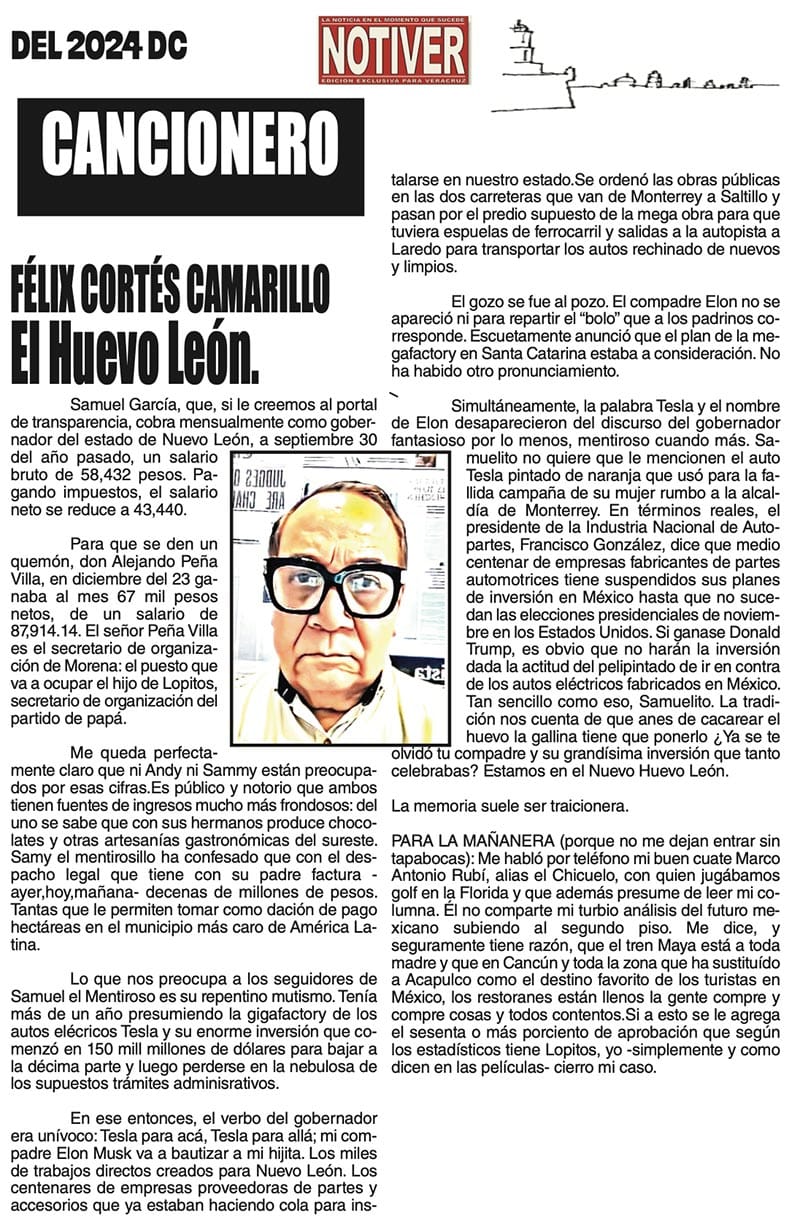 CANCIONERO | EL HUEVO LEÓN - Samuel García, que, si le creemos al portal de transparencia, cobra mensualmente como gobernador del estado de Nuevo León, a septiembre 30 del año pasado, un salario bruto...