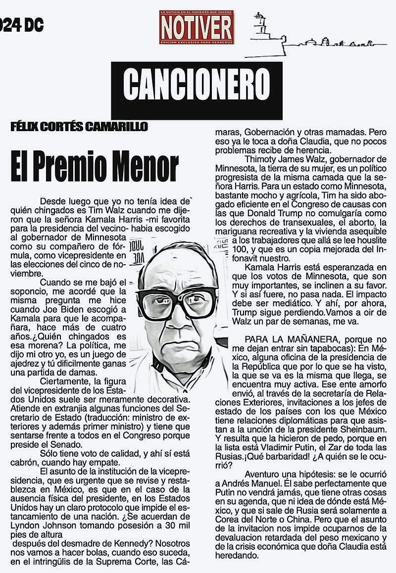 CANCIONERO | EL PREMIO MENOR - Desde luego que yo no tenía idea de quién chingados es Tim Walz cuando me dijeron que la señora Kamala Harris -mi favorita para la presidencia del vecino habia escogido...
