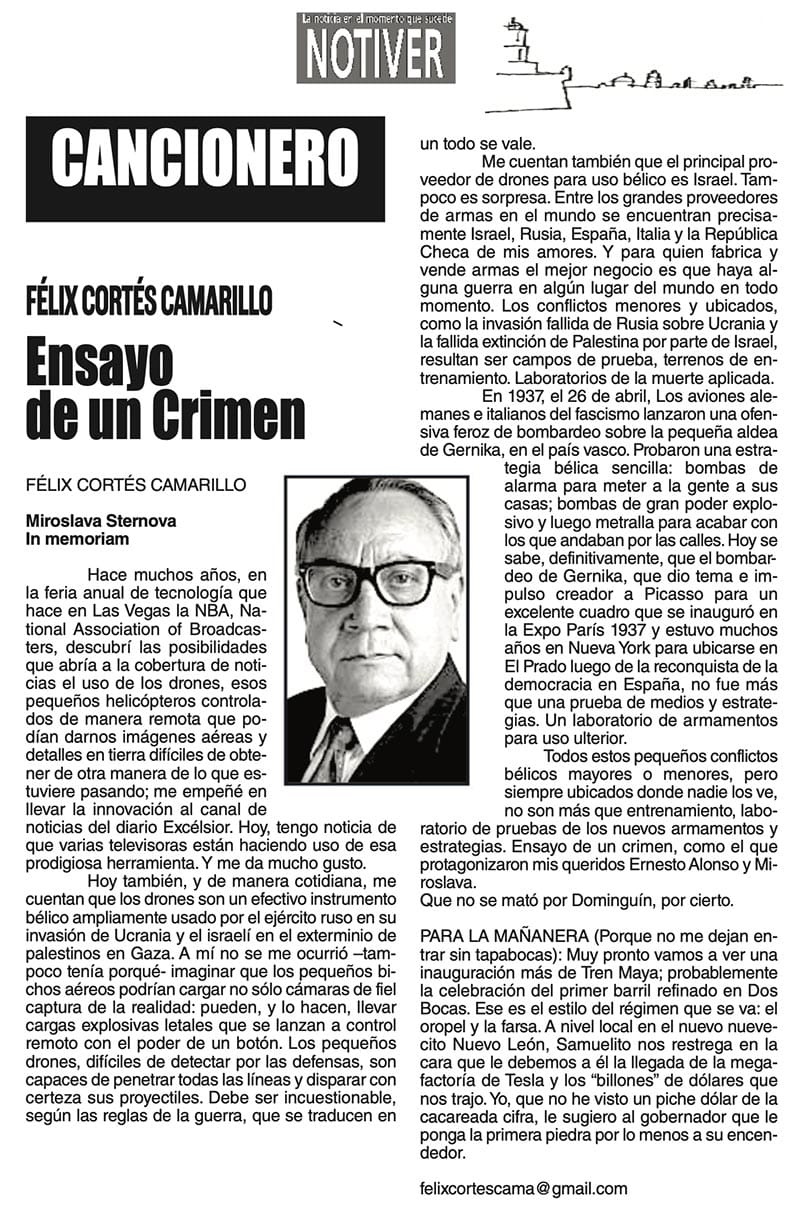 LAS COLUMNAS CANCIONERO - ENSAYO DE UN CRIMEN- Hace muchos años, en la feria anual de tecnología que hace en Las Vegas la NBA... ENSAYO DE UN CRIMEN... 9 febrero 2024 Más Noticias LAS COSAS COMO SON | - MAS QUE UN DIARIO... TEXTO IRREVERENTE | LE VA A 'ECHAR GANITAS' - Al parecer, el asunto es 'chimoltrufiar' o sea lo mismo decir una cosa que otra. En marzo, el gobierno estatal informó que el programa de rehabilitación de carreteras y caminos conocido como "Bachetón"... ACERTIJOS | EL QUINTO PARTIDO - En la historia de los mundiales, México nunca ha jugado el quinto partido fuera de casa. Lo más que hemos alcanzado es el cuarto juego y de allí nos mandan a casa… A MIL POR HORA | - **Un matrimonio feliz **Apocalipsis jarocho **La isla de los pedófilos **“Amor con amor se paga”... A MIL POR HORA | - **Chicas más guapas **Días revolcados **Fascinantes artistas **Academia de Ególatras... CANCIONERO | EL PAN Y EL LLORO - Nada es accidental en la política. Este fin de semana, la señora presidente con A de patria tendrá una magna concentración de sus seguidores para celebrar el aniversario... TEXTO IRREVERENTE | ENNOCHEBUENADOS - La mercadotecnia adelanta todo y, ni modo, hay que lidiar con eso. Cuando todavía no acababa noviembre ya se vendían productos navideños y ahora mismo por doquiera se ven locales adornados con ese motivo... SIN TACTO | LAS VÍSPERAS - ¿Se acuerda la memorable lectora? ¿Recuerda el memorioso lector?: “Ya va llegando diciembre y sus posadas. Se va acercando ya también la Navidad. El año nuevo... LAS COSAS COMO SON - VAYA CINISMO... TEXTO IRREVERENTE | AÑO BUENO, AÑO MALO - El 2024 fue un año de suerte y abundancia. Este 2025 ha corrido en su contra con infortunio político y mediático. ¿‘Annus horribilis’? Tal vez no llega a tanto, pero sí desastroso y confirmatorio de sus...