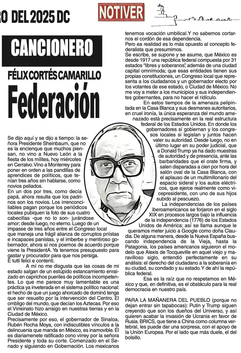 CANCIONERO | FEDERACIÓN - Se dijo aquí y se dijo a tiempo: la señora Presidente Sheinbaum, que no es la enclenque que muchos piensan, no vino a Nuevo León a la fiesta de los mílites, hoy miércoles...