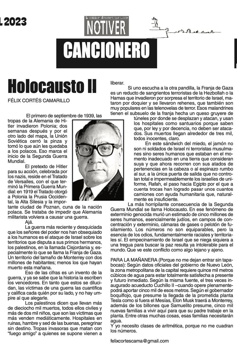 LAS COLUMNAS CANCIONERO - HOLOCAUSTO II HOLOCAUSTO II... 19 diciembre 2023 Más Noticias LAS COSAS COMO SON | - MAS QUE UN DIARIO... TEXTO IRREVERENTE | LE VA A 'ECHAR GANITAS' - Al parecer, el asunto es 'chimoltrufiar' o sea lo mismo decir una cosa que otra. En marzo, el gobierno estatal informó que el programa de rehabilitación de carreteras y caminos conocido como "Bachetón"... ACERTIJOS | EL QUINTO PARTIDO - En la historia de los mundiales, México nunca ha jugado el quinto partido fuera de casa. Lo más que hemos alcanzado es el cuarto juego y de allí nos mandan a casa… A MIL POR HORA | - **Un matrimonio feliz **Apocalipsis jarocho **La isla de los pedófilos **“Amor con amor se paga”... A MIL POR HORA | - **Chicas más guapas **Días revolcados **Fascinantes artistas **Academia de Ególatras... CANCIONERO | EL PAN Y EL LLORO - Nada es accidental en la política. Este fin de semana, la señora presidente con A de patria tendrá una magna concentración de sus seguidores para celebrar el aniversario... TEXTO IRREVERENTE | ENNOCHEBUENADOS - La mercadotecnia adelanta todo y, ni modo, hay que lidiar con eso. Cuando todavía no acababa noviembre ya se vendían productos navideños y ahora mismo por doquiera se ven locales adornados con ese motivo... SIN TACTO | LAS VÍSPERAS - ¿Se acuerda la memorable lectora? ¿Recuerda el memorioso lector?: “Ya va llegando diciembre y sus posadas. Se va acercando ya también la Navidad. El año nuevo... LAS COSAS COMO SON - VAYA CINISMO... TEXTO IRREVERENTE | AÑO BUENO, AÑO MALO - El 2024 fue un año de suerte y abundancia. Este 2025 ha corrido en su contra con infortunio político y mediático. ¿‘Annus horribilis’? Tal vez no llega a tanto, pero sí desastroso y confirmatorio de sus...