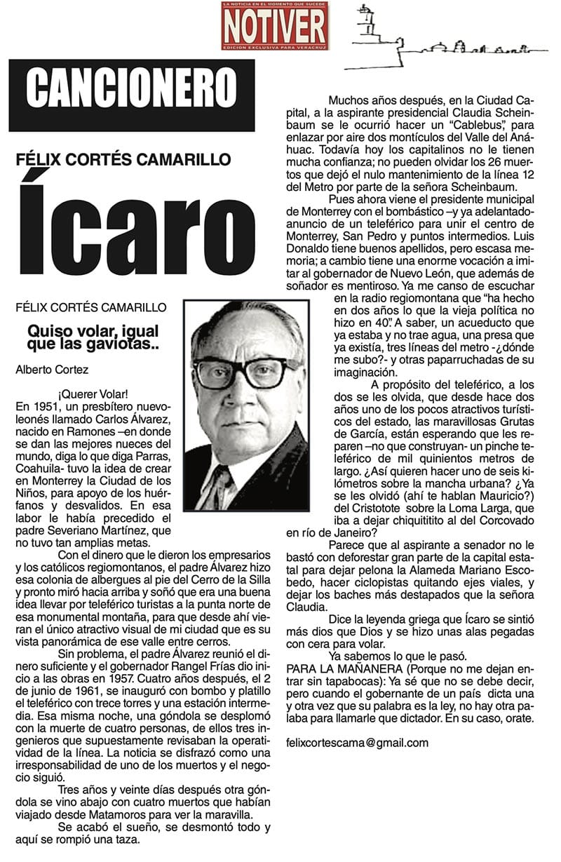 LAS COLUMNAS CANCIONERO | ÍCARO - ¡Querer Volar! En 1951, un presbítero nuevoleonés llamado Carlos Álvarez, nacido en Ramones -en donde se dan la mejores nueves del mundo, diga lo que diga Parras, Coahuila-... ÍCARO... 27 febrero 2024 Más Noticias TURISMÓLOGO | IMPULSAN ECONOMÍA TURÍSTICA - Importante el brindar siempre "Calidad Total en el Servicio al Cliente" siendo igual para al que consume poco, como al que mucho...! Contar con un rostro siempre… TRASTIENDA | MANDARINAZO - Trascendió que existe una escasez de mandarina en la zona norte de Veracruz luego de las recientes lluvias, los municipios más afectados son Álamo Temapache y Poza Rica, la escasez ha provocado... A MIL POR HORA | - **Personas tóxicas **Amigos de seniles **Venus de migrantes **Festival Mundial de Cine... TEXTO IRREVERENTE | UN ARTE ETERNO - Envejecer haciendo periodismo no es sinónimo de obsolescencia ni de ser retardatario. La llamada ‘vieja guardia’ de la reporteada y del análisis periodístico... DIARIO DE UN REPORTERO | Y TODO ¿PARA QUÉ? - Tres días estuvo cerrado el centro de Xalapa porque se preparaba el escenario para el primer informe de la gobernadora Rocío Nahle. El tránsito... ACERTIJOS | NACEN LOS RIVALES EN FIFA - Es la mañana del sorteo de FIFA, en Washington, que amanece con un frio del carajo a 2 grados bajo cero y con caída de nieve. Llegan al Kennedy Center… A MIL POR HORA | - **5 películas icónicas **Seniles: bailar en casa **Marilyn y Chanel 5 **Sabroso quesito fundido... LAS COSAS COMO SON | - MAS QUE UN DIARIO... TEXTO IRREVERENTE | LE VA A 'ECHAR GANITAS' - Al parecer, el asunto es 'chimoltrufiar' o sea lo mismo decir una cosa que otra. En marzo, el gobierno estatal informó que el programa de rehabilitación de carreteras y caminos conocido como "Bachetón"... ACERTIJOS | EL QUINTO PARTIDO - En la historia de los mundiales, México nunca ha jugado el quinto partido fuera de casa. Lo más que hemos alcanzado es el cuarto juego y de allí nos mandan a casa…