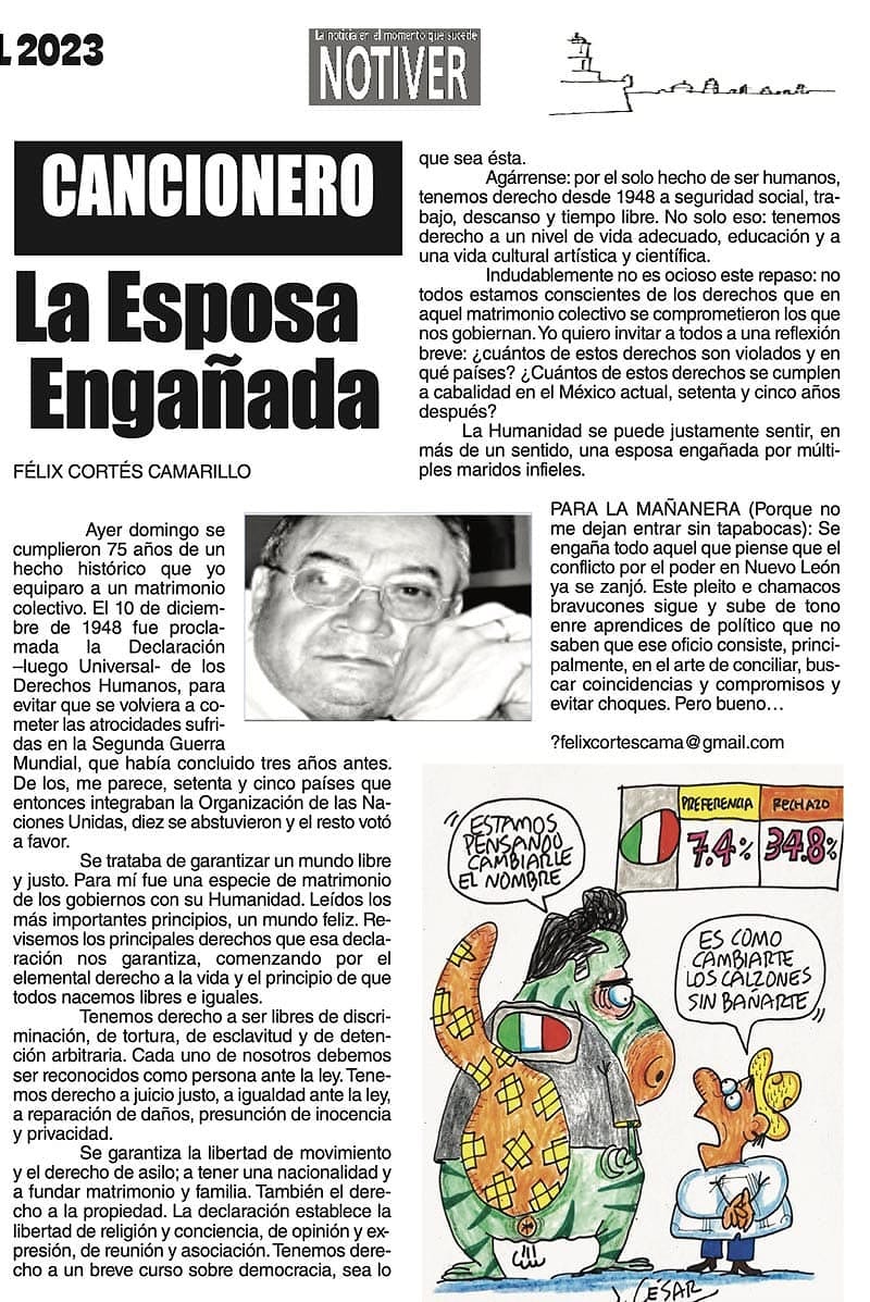 LAS COLUMNAS CANCIONERO - LA ESPOSA ENGAÑADA LA ESPOSA ENGAÑADA... 11 diciembre 2023 Más Noticias LAS COSAS COMO SON | - MAS QUE UN DIARIO... TEXTO IRREVERENTE | LE VA A 'ECHAR GANITAS' - Al parecer, el asunto es 'chimoltrufiar' o sea lo mismo decir una cosa que otra. En marzo, el gobierno estatal informó que el programa de rehabilitación de carreteras y caminos conocido como "Bachetón"... ACERTIJOS | EL QUINTO PARTIDO - En la historia de los mundiales, México nunca ha jugado el quinto partido fuera de casa. Lo más que hemos alcanzado es el cuarto juego y de allí nos mandan a casa… A MIL POR HORA | - **Un matrimonio feliz **Apocalipsis jarocho **La isla de los pedófilos **“Amor con amor se paga”... A MIL POR HORA | - **Chicas más guapas **Días revolcados **Fascinantes artistas **Academia de Ególatras... CANCIONERO | EL PAN Y EL LLORO - Nada es accidental en la política. Este fin de semana, la señora presidente con A de patria tendrá una magna concentración de sus seguidores para celebrar el aniversario... TEXTO IRREVERENTE | ENNOCHEBUENADOS - La mercadotecnia adelanta todo y, ni modo, hay que lidiar con eso. Cuando todavía no acababa noviembre ya se vendían productos navideños y ahora mismo por doquiera se ven locales adornados con ese motivo... SIN TACTO | LAS VÍSPERAS - ¿Se acuerda la memorable lectora? ¿Recuerda el memorioso lector?: “Ya va llegando diciembre y sus posadas. Se va acercando ya también la Navidad. El año nuevo... LAS COSAS COMO SON - VAYA CINISMO... TEXTO IRREVERENTE | AÑO BUENO, AÑO MALO - El 2024 fue un año de suerte y abundancia. Este 2025 ha corrido en su contra con infortunio político y mediático. ¿‘Annus horribilis’? Tal vez no llega a tanto, pero sí desastroso y confirmatorio de sus...