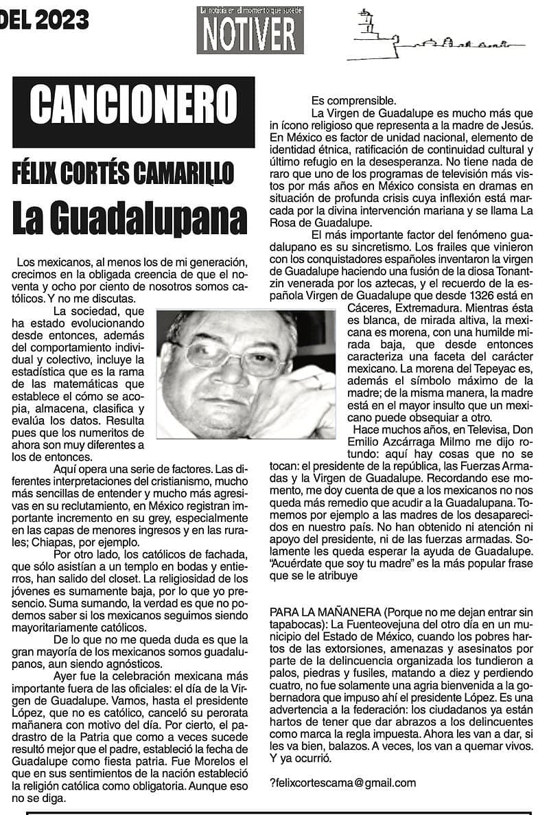 LAS COLUMNAS CANCIONERO - LA GUADALUPANA LA GUADALUPANA... 13 diciembre 2023 Más Noticias TEXTO IRREVERENTE | MAÑANEANDO - Una felicitación para el periodista Oved Contreras pues hoy festeja su cumpleaños. El colega amaneció mañaneando o sea oyendo "Las Mañanitas" entonadas por los tremendos Citlali, Lalo y Ovito... A Mil Por Hora | - **Héroes infantiles **Soñar en grande **Vaya tipo de empleos **Hacerse tonto… REFLEXIONES - MÁS DIESEL REGALADO... CANCIONERO | LUCES, CÁMARA... - A principios del siglo pasado, el naciente cine, que no podía ignorar al naciente y enorme mercado americano, decidió mudarse de Nueva York a California... ACERTIJOS | EL PAPO LEVET (DEP) - Luis Ugalde suele ser un buen amigo, servidor público en Trabajo federal por 30 años y secretario particular del gobernador Fidel Herrera Beltrán, que aguantó todo el camino de los 6 años... SIN TACTO | RAÚL PEIMBERT, EL MEJOR - Eso de la Medalla Ruiz Cortines que otorgó la Legislatura este año se me hace como si el Instituto Veracruzano del Deporte hubiera decidido dar un premio al mejor futbolista… CANCIONERO | LEGADO DE GRANDEZA - No es necesario ser fanático seguidor del papá de Andy y su movimiento para reconocer que el discurso de la señora presidente con A de patria el sábado pasado, fue impecable… LAS COSAS COMO SON - PURA POLILLA... ACERTIJOS | ECOS DEL SORTEO MUNDIALISTA - Allá andaban todos, tapándose del frio de 2 grados bajo cero en Washington, frío de esos que calan, pero el calor llegaba al Kennedy Center, un sitio para la cultura y las artes que abrió... TEXTO IRREVERENTE | APOSTÓ Y ERRÓ - Sorprendió -debe admitirse- el viraje del régimen morenista sobre el caso del exgobernador Javier Duarte de Ochoa quien ya se hacía disfrutando las navidades en Londres...