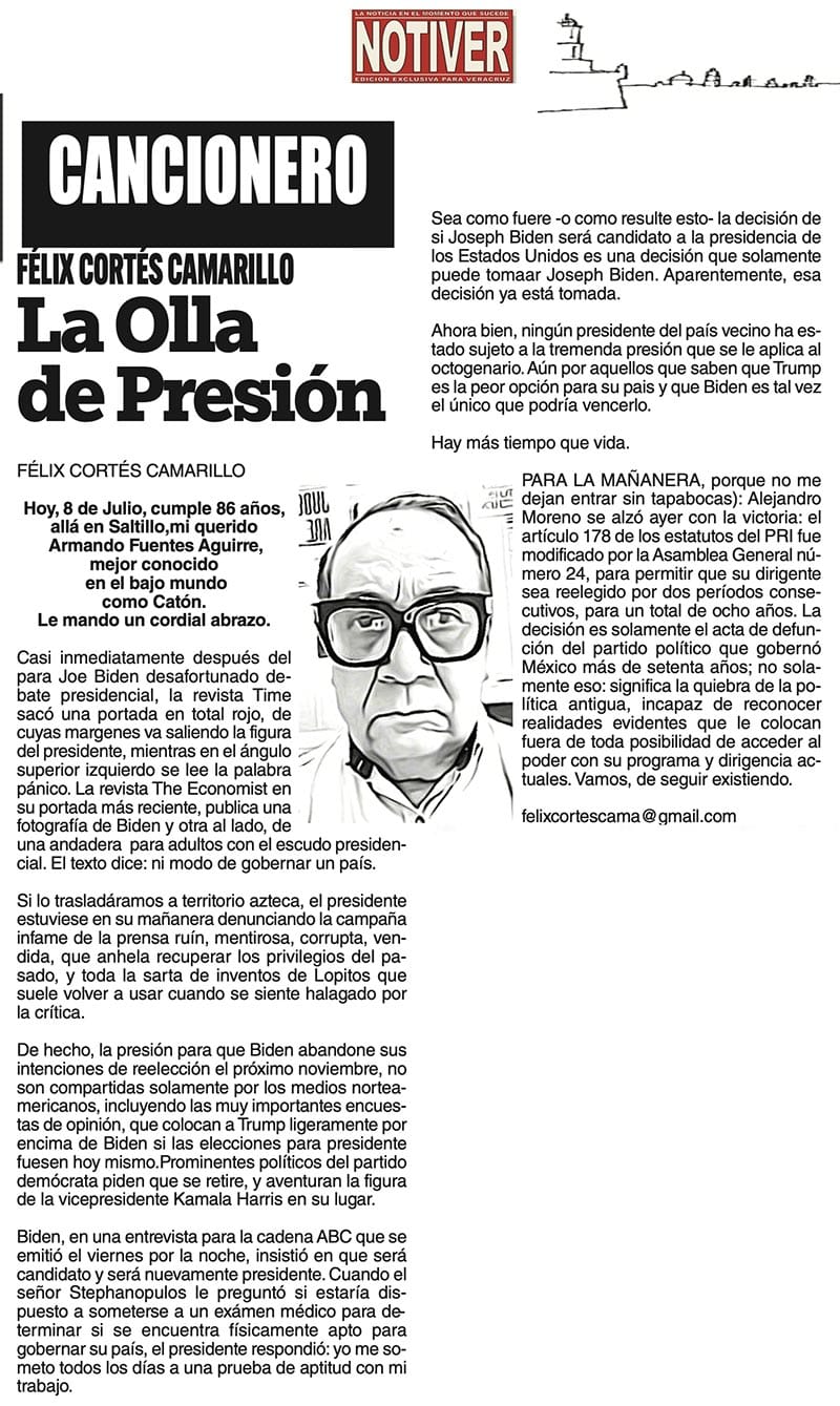 CANCIONERO | LA OLLA DE PRESIÓN - Casi inmediatamente después del para Joe Biden desafortunado debate presidencial, la revista Time sacó una portada en total rojo, de cuyas margenes va saliendo la figura del presidente...