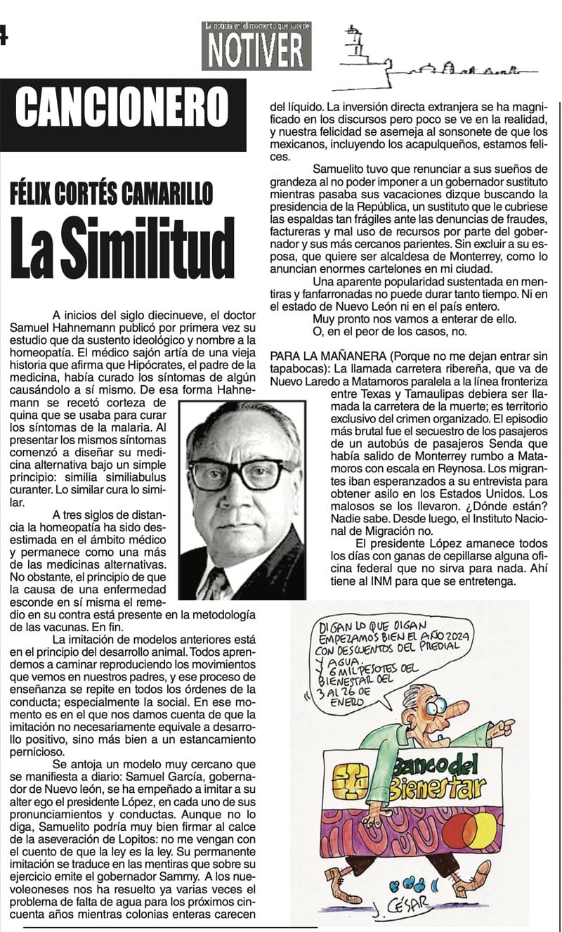 LAS COLUMNAS CANCIONERO - LA SIMILITUD LA SIMILITUD... 3 enero 2024 Más Noticias A MIL POR HORA | - **Chicas más guapas **Días revolcados **Fascinantes artistas **Academia de Ególatras... CANCIONERO | EL PAN Y EL LLORO - Nada es accidental en la política. Este fin de semana, la señora presidente con A de patria tendrá una magna concentración de sus seguidores para celebrar el aniversario... TEXTO IRREVERENTE | ENNOCHEBUENADOS - La mercadotecnia adelanta todo y, ni modo, hay que lidiar con eso. Cuando todavía no acababa noviembre ya se vendían productos navideños y ahora mismo por doquiera se ven locales adornados con ese motivo... SIN TACTO | LAS VÍSPERAS - ¿Se acuerda la memorable lectora? ¿Recuerda el memorioso lector?: “Ya va llegando diciembre y sus posadas. Se va acercando ya también la Navidad. El año nuevo... LAS COSAS COMO SON - VAYA CINISMO... TEXTO IRREVERENTE | AÑO BUENO, AÑO MALO - El 2024 fue un año de suerte y abundancia. Este 2025 ha corrido en su contra con infortunio político y mediático. ¿‘Annus horribilis’? Tal vez no llega a tanto, pero sí desastroso y confirmatorio de sus... SIN TACTO | ¿PORRAS A NOROÑA? - El cada vez más impresentable y alocado Gerardo Fernández Noroña le hizo el dudoso honor y el muy flaco favor a la gobernadora Rocío Nahle… ACERTIJOS | - Decía un gran columnista, que aunque fuera día de celebración o de cumple o de lo que sea, nunca hay que dejar de teclear algo, para seguir activos. Hoy es mi cumple... CANCIONERO | EL FISCAL INCÓMODO - Nadie pudo imaginar que un incidente en el concurso de Miss Universo, esa feria machista de la carne y la lascivia, disfrazada del más pueril nacionalismo, fuera a… A MIL POR HORA | - **Un día feliz **Amores prohibidos **$350 mil de recompensas **La política más joven...