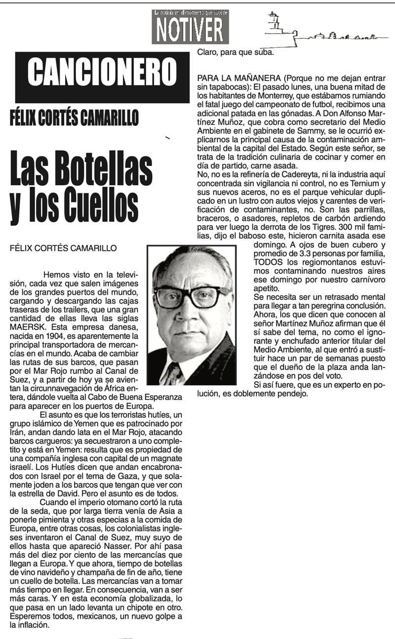 LAS COLUMNAS CANCIONERO - LAS BOTELLAS Y LOS CUELLOS LAS BOTELLAS Y LOS CUELLOS... 21 diciembre 2023 Más Noticias TEXTO IRREVERENTE | UN ARTE ETERNO - Envejecer haciendo periodismo no es sinónimo de obsolescencia ni de ser retardatario. La llamada ‘vieja guardia’ de la reporteada y del análisis periodístico... DIARIO DE UN REPORTERO | Y TODO ¿PARA QUÉ? - Tres días estuvo cerrado el centro de Xalapa porque se preparaba el escenario para el primer informe de la gobernadora Rocío Nahle. El tránsito... ACERTIJOS | NACEN LOS RIVALES EN FIFA - Es la mañana del sorteo de FIFA, en Washington, que amanece con un frio del carajo a 2 grados bajo cero y con caída de nieve. Llegan al Kennedy Center… A MIL POR HORA | - **5 películas icónicas **Seniles: bailar en casa **Marilyn y Chanel 5 **Sabroso quesito fundido... LAS COSAS COMO SON | - MAS QUE UN DIARIO... TEXTO IRREVERENTE | LE VA A 'ECHAR GANITAS' - Al parecer, el asunto es 'chimoltrufiar' o sea lo mismo decir una cosa que otra. En marzo, el gobierno estatal informó que el programa de rehabilitación de carreteras y caminos conocido como "Bachetón"... ACERTIJOS | EL QUINTO PARTIDO - En la historia de los mundiales, México nunca ha jugado el quinto partido fuera de casa. Lo más que hemos alcanzado es el cuarto juego y de allí nos mandan a casa… A MIL POR HORA | - **Un matrimonio feliz **Apocalipsis jarocho **La isla de los pedófilos **“Amor con amor se paga”... A MIL POR HORA | - **Chicas más guapas **Días revolcados **Fascinantes artistas **Academia de Ególatras... CANCIONERO | EL PAN Y EL LLORO - Nada es accidental en la política. Este fin de semana, la señora presidente con A de patria tendrá una magna concentración de sus seguidores para celebrar el aniversario...
