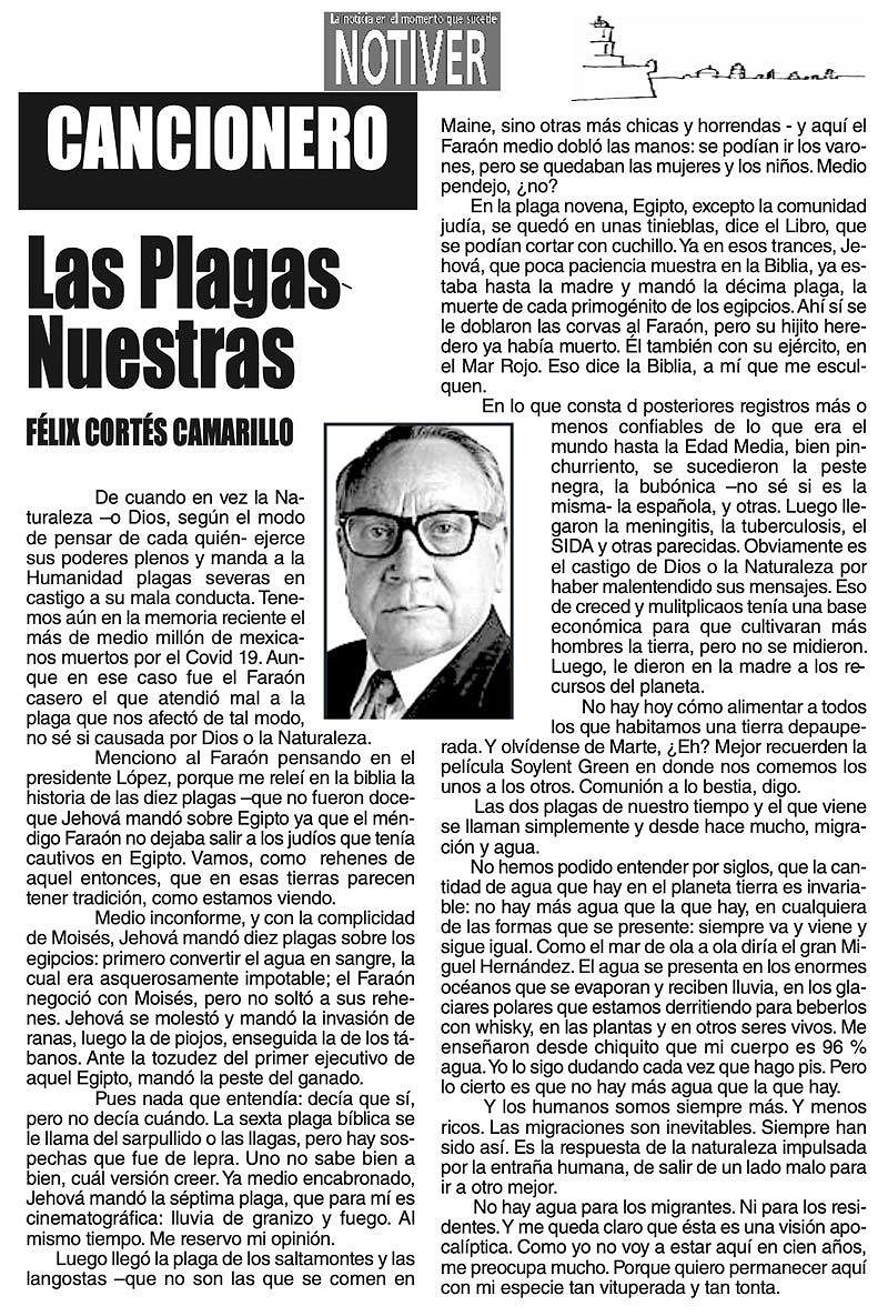 LAS COLUMNAS CANCIONERO -LAS PLAYAS NUESTRAS LAS PLAYAS NUESTRAS... 24 octubre 2023 Más Noticias LAS COSAS COMO SON | - MAS QUE UN DIARIO... TEXTO IRREVERENTE | LE VA A 'ECHAR GANITAS' - Al parecer, el asunto es 'chimoltrufiar' o sea lo mismo decir una cosa que otra. En marzo, el gobierno estatal informó que el programa de rehabilitación de carreteras y caminos conocido como "Bachetón"... ACERTIJOS | EL QUINTO PARTIDO - En la historia de los mundiales, México nunca ha jugado el quinto partido fuera de casa. Lo más que hemos alcanzado es el cuarto juego y de allí nos mandan a casa… A MIL POR HORA | - **Un matrimonio feliz **Apocalipsis jarocho **La isla de los pedófilos **“Amor con amor se paga”... A MIL POR HORA | - **Chicas más guapas **Días revolcados **Fascinantes artistas **Academia de Ególatras... CANCIONERO | EL PAN Y EL LLORO - Nada es accidental en la política. Este fin de semana, la señora presidente con A de patria tendrá una magna concentración de sus seguidores para celebrar el aniversario... TEXTO IRREVERENTE | ENNOCHEBUENADOS - La mercadotecnia adelanta todo y, ni modo, hay que lidiar con eso. Cuando todavía no acababa noviembre ya se vendían productos navideños y ahora mismo por doquiera se ven locales adornados con ese motivo... SIN TACTO | LAS VÍSPERAS - ¿Se acuerda la memorable lectora? ¿Recuerda el memorioso lector?: “Ya va llegando diciembre y sus posadas. Se va acercando ya también la Navidad. El año nuevo... LAS COSAS COMO SON - VAYA CINISMO... TEXTO IRREVERENTE | AÑO BUENO, AÑO MALO - El 2024 fue un año de suerte y abundancia. Este 2025 ha corrido en su contra con infortunio político y mediático. ¿‘Annus horribilis’? Tal vez no llega a tanto, pero sí desastroso y confirmatorio de sus...