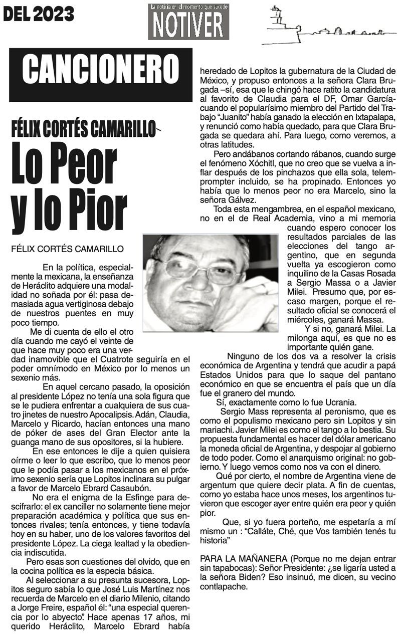 LAS COLUMNAS CANCIONERO -LO PEOR Y LO PIOR LO PEOR Y LO PIOR... 20 noviembre 2023 Más Noticias CANCIONERO | 1938, OTRA VEZ - Me sorprende la ligereza con la que algunos analistas mexicanos han juzgado el discurso del miércoles por la noche del presidente Donald Trump, y la implícita amenaza de acciones militares... TEXTO IRREVERENTE | A LA PUERTA - Un escándalo de corrupción le estalló en su puerta al hidalguense Ricardo Ahued: el "cartel inmobiliario" en el que están involucrados jueces, notarios, empresarios y funcionarios... A MIL POR HORA | - **Tener miedo **Vivir con miedo **Cambios en Xalapa **Feliz con Alexa... LAS COSAS COMO SON | - ME PUSE A CHIFLAR... ACERTIJOS | NO TENGÁIS MIEDO - Todos los católicos y no católicos, recordamos las primeras palabras de Juan Pablo Segundo, cuando fue entronizado Papa y salió al balcón del Vaticano, donde ellos suelen... MIRADOR | - Los espectros que vagan en la noche por los aposentos de la casona del Potrero piensan que yo también soy un espectro, y me tratan con familiaridad. Doña Lucita de la Peña y Dávila... A MIL POR HORA | - **Una mujer tóxica **Marino asesinado **Julissa deslumbrante **Político incómodo... CANCIONERO | LAS AGUAS MEDIAS - Lo que menos me gusta de la modernidad es que cada vez me entero de más cosas ingratas. Viendo las noticias en las estaciones de televisión los Estados Unidos, especialmente… TEXTO IRREVERENTE | FINAL KÁRMICO - Hace cuatro años, los alcaldes electos de Fortín de las Flores, Córdoba y Medellín de Bravo, morenistas todos, hicieron campaña e iniciaron sus gobiernos con críticas, descalificaciones... SIN TACTO | BIBI EN PUENTE NACIONAL - Por primera vez, Movimiento Ciudadano va a gobernar el municipio de Puente Nacional, aunque será la tercera ocasión en que una mujer lidera la comuna: Bibiana Báez…