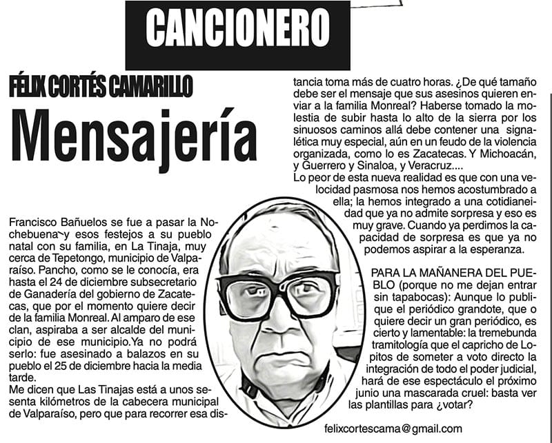 CANCIONERO | MENSAJERÍA - Francisco Bañuelos se fue a pasar la Nochebuena y esos festejos a su pueblo natal con su familia, en La Tinaja, muy cerca de Tepetongo, municipio de Valpa-raíso...