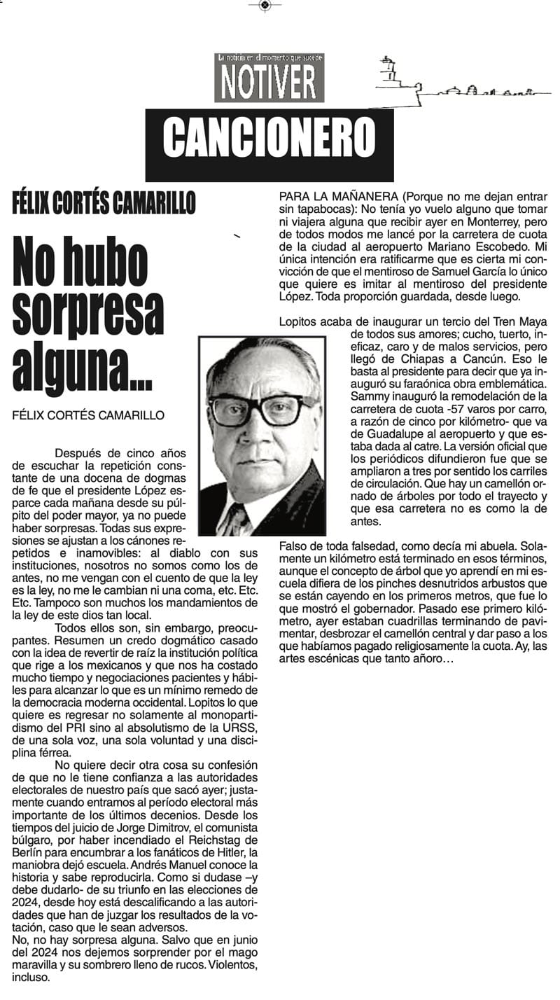 LAS COLUMNAS CANCIONERO - NO HUBO SORPRESA ALGUNA... NO HUBO SORPRESA ALGUNA... 20 diciembre 2023 Más Noticias LAS COSAS COMO SON | - MAS QUE UN DIARIO... TEXTO IRREVERENTE | LE VA A 'ECHAR GANITAS' - Al parecer, el asunto es 'chimoltrufiar' o sea lo mismo decir una cosa que otra. En marzo, el gobierno estatal informó que el programa de rehabilitación de carreteras y caminos conocido como "Bachetón"... ACERTIJOS | EL QUINTO PARTIDO - En la historia de los mundiales, México nunca ha jugado el quinto partido fuera de casa. Lo más que hemos alcanzado es el cuarto juego y de allí nos mandan a casa… A MIL POR HORA | - **Un matrimonio feliz **Apocalipsis jarocho **La isla de los pedófilos **“Amor con amor se paga”... A MIL POR HORA | - **Chicas más guapas **Días revolcados **Fascinantes artistas **Academia de Ególatras... CANCIONERO | EL PAN Y EL LLORO - Nada es accidental en la política. Este fin de semana, la señora presidente con A de patria tendrá una magna concentración de sus seguidores para celebrar el aniversario... TEXTO IRREVERENTE | ENNOCHEBUENADOS - La mercadotecnia adelanta todo y, ni modo, hay que lidiar con eso. Cuando todavía no acababa noviembre ya se vendían productos navideños y ahora mismo por doquiera se ven locales adornados con ese motivo... SIN TACTO | LAS VÍSPERAS - ¿Se acuerda la memorable lectora? ¿Recuerda el memorioso lector?: “Ya va llegando diciembre y sus posadas. Se va acercando ya también la Navidad. El año nuevo... LAS COSAS COMO SON - VAYA CINISMO... TEXTO IRREVERENTE | AÑO BUENO, AÑO MALO - El 2024 fue un año de suerte y abundancia. Este 2025 ha corrido en su contra con infortunio político y mediático. ¿‘Annus horribilis’? Tal vez no llega a tanto, pero sí desastroso y confirmatorio de sus...