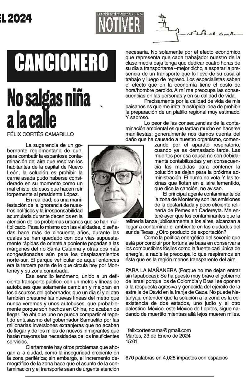 LAS COLUMNAS CANCIONERO - NO SALGAS NIÑA A LA CALLE... NO SALGAS NIÑA A LA CALLE... 24 enero 2024 Más Noticias ACERTIJOS | LOS 100 AÑOS DE JULIO SCHERER - Julio Scherer García murió en 2015. La unanimidad, esa flor rara, rodeó sus funerales con la corona de la admiración. En estos días cumplió cien años de su nacimiento y la prensa recuperó algo de... A MIL POR HORA | - **Perfil de un mexicano **El jarocho patriota **La lengua más larga **Estilo Porfiriano... SIN TACTO | LA UV DISCRIMINA A JUAN JOSÉ BARRIENTOS - Juan José Barrientos es un ave de tempestades, como corresponde a todo escritor genial. En su larga, larguísima trayectoria literaria ha acumulado estudios y experiencia que se han adjuntado… TEXTO IRREVERENTE | FASCISMO ANTIHUERTISTA - Antes fue deducción, ahora es certeza. Desde el congreso local que dirige Esteban Bautista se financian asambleas y propaganda para denostar al senador Manuel Huerta. Es decir, se utiliza el... CANCIONERO | INTELIGENCIA - No me pidan que sustente la veracidad de lo que voy a escribir enseguida, porque no puedo hacerlo; tampoco voy a proporcionar fuentes de información fidedignas, ni pruebas documentales confiables. No me las pidan... CANCIONERO | CANDIL DE LA CALLE - Ya corrió bastante tinta, inclusive en este espacio, reconociendo la simplemente digna conducta de la señora presidente con A de mujer durante sus muy publicitadas apariciones en su breve visita a Barcelona y... ACERTIJOS | DOS MUJERES. DOS PASIONES - Dos mujeres que piensan diferente y que, quizá estarán en trincheras opositoras. Una ya gobierna un país grande, México, la otra va a ser pronto la presidenta de Venezuela, en cuanto se ponga más quieto aquel... TEXTO IRREVERENTE | EN TRES ACTOS - Primer acto. Miguel Ángel Anaya Castillo, periodista independiente y dueño del portal informativo “Pánuco On Line” incomoda al poder municipal por reportar los abusos de poder y andanas insanas del alcalde… A MIL POR HORA | - **El mundo animal… **Retrato de Veracruz **Jarocho de Jack London **Lo mejor y peor del día... SIN TACTO | LA BRONCA EN SALUD ESTATAL - Son 26 mil trabajadores los que tiene en Veracruz el sector Salud y son ellos mismos los que están en un movimiento activo para exigir sus derechos no cumplidos y que se ponga la atención debida a los servicios...