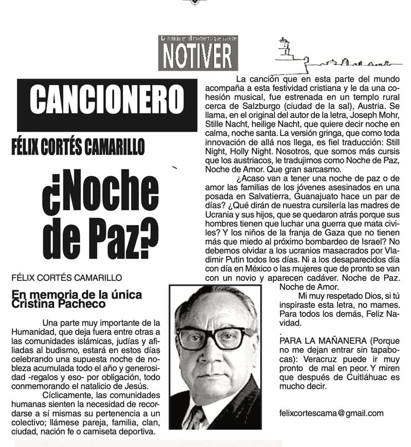 LAS COLUMNAS CANCIONERO - ¿NOCHE DE PAZ? ¿NOCHE DE PAZ?... 22 diciembre 2023 Más Noticias LAS COSAS COMO SON | - MAS QUE UN DIARIO... TEXTO IRREVERENTE | LE VA A 'ECHAR GANITAS' - Al parecer, el asunto es 'chimoltrufiar' o sea lo mismo decir una cosa que otra. En marzo, el gobierno estatal informó que el programa de rehabilitación de carreteras y caminos conocido como "Bachetón"... ACERTIJOS | EL QUINTO PARTIDO - En la historia de los mundiales, México nunca ha jugado el quinto partido fuera de casa. Lo más que hemos alcanzado es el cuarto juego y de allí nos mandan a casa… A MIL POR HORA | - **Un matrimonio feliz **Apocalipsis jarocho **La isla de los pedófilos **“Amor con amor se paga”... A MIL POR HORA | - **Chicas más guapas **Días revolcados **Fascinantes artistas **Academia de Ególatras... CANCIONERO | EL PAN Y EL LLORO - Nada es accidental en la política. Este fin de semana, la señora presidente con A de patria tendrá una magna concentración de sus seguidores para celebrar el aniversario... TEXTO IRREVERENTE | ENNOCHEBUENADOS - La mercadotecnia adelanta todo y, ni modo, hay que lidiar con eso. Cuando todavía no acababa noviembre ya se vendían productos navideños y ahora mismo por doquiera se ven locales adornados con ese motivo... SIN TACTO | LAS VÍSPERAS - ¿Se acuerda la memorable lectora? ¿Recuerda el memorioso lector?: “Ya va llegando diciembre y sus posadas. Se va acercando ya también la Navidad. El año nuevo... LAS COSAS COMO SON - VAYA CINISMO... TEXTO IRREVERENTE | AÑO BUENO, AÑO MALO - El 2024 fue un año de suerte y abundancia. Este 2025 ha corrido en su contra con infortunio político y mediático. ¿‘Annus horribilis’? Tal vez no llega a tanto, pero sí desastroso y confirmatorio de sus...