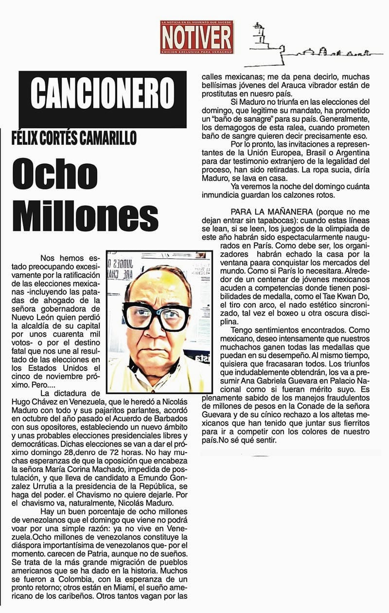 CANCIONERO | OCHO MILLONES - Nos hemos estado preocupando excesivamente por la ratificación de las elecciones mexicanas incluyendo las patadas de ahogado de la señora gobernadora de Nuevo León...