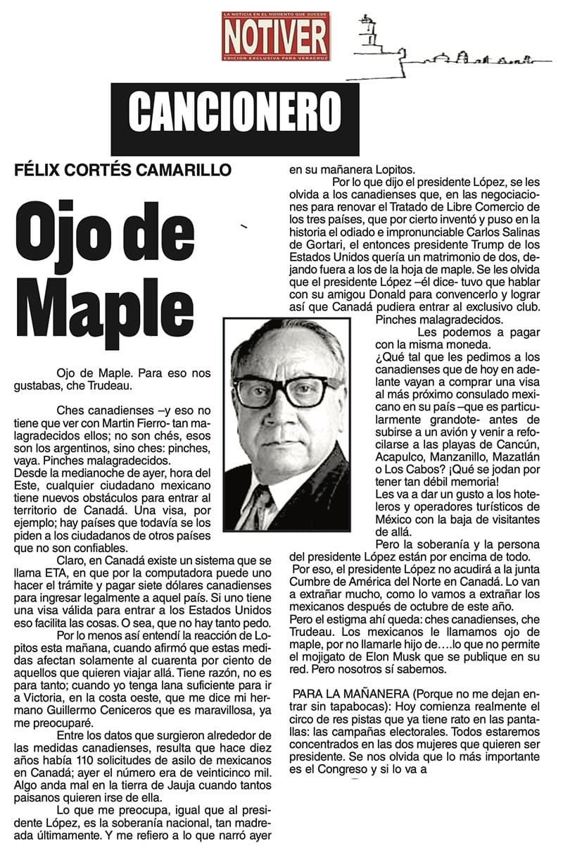 LAS COLUMNAS CANCIONERO | OJO DE MAPLE - Ches canadienses -y eso no tiene que ver con Martin Fierro- tan malagradecidos ellos; no son chés, esos son los argentinos... OJO DE MAPLE... 1 marzo 2024 Más Noticias CANCIONERO | PIRATAS DEL CARIBE - A la pregunta de qué va a hacer con el petróleo que llevaba el barco tanque grandote llamado Skipper y con bandera falsa de Guyana, que sus fuerzas armadas... ACERTIJOS | LOS 51 AÑOS DE NOTIVER - Allá por los años 70s nacía Notiver. Un día Guadalupano por un asunto de festejo familiar. Desde aquel día de hace 51 años, que este 12 de diciembre se cumplen, el diario... TEXTO IRREVERENTE | - Monumental, mágico, misterioso y meritorio. Así definen arqueólogos y antropólogos a El Tajín, la ciudad prehispánica que se ubica cerca de Papantla, al norte veracruzano... A MIL POR HORA | - **Los duendes existen **Honrar al IMSS **Comadrita traviesa **Javier Duarte seguirá preso... TEXTO IRREVERENTE | CINCUENTA + UNO - La familia notiveriana está velando vísperas pues mañana es su fiesta magna, la que tiene lugar cada fin de otoño, ya pisando el invierno. El cumpleaños de NOTIVER comparte fecha... CANCIONERO | EL GOZO AL POZO...DE AGUA - Muy pronto se apagó el argüende mediático armado desde Palacio Nacional, en torno a la señora presidente con A de patria, celebrando con sonrisa pareja del primer ministro de Canadá, el bailoteo al ritmo de YMCA... SIN TACTO | 4T, LAS CUENTAS ALEGRES - Bueno, cuando menos podemos aceptar que los morenos en el poder tienen una capacidad: seguir al pie de la letra las instrucciones del librito que indica cómo responder y qué decir… ACERTIJOS | POR LOS 51 DE NOTIVER - Un día antes auguraban un gran Norte, que entró en lunes. Al iniciar semana. Cotidianamente llegó con mi hermano Enrique, con Fernando Pavón, biógrafo de Tierra Blanca y el amigo... 51 Y CONTANDO… | - Medio siglo y un año, no se escribe ni fácil ni sin derramar una que otra lagrimilla: 51 años de éste su periódico NOTIVER. La Noticia en el momento que sucede, es un acontecimiento más... A MIL POR HORA | - **Migrante exitoso **Genio universal **Manipulador de mujeres **Ley vs vapeadores...