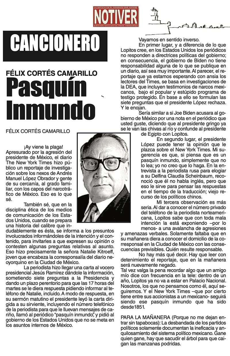 LAS COLUMNAS CANCIONERO | PASQUÍN INMUNDO - ¡Ay viene la plaga! Apresurado por la agresión del presidente de México, el diario The New York Times hizo publico un reportaje... PASQUÍN INMUNDO... 23 febrero 2024 Más Noticias LAS COSAS COMO SON | - MAS QUE UN DIARIO... TEXTO IRREVERENTE | LE VA A 'ECHAR GANITAS' - Al parecer, el asunto es 'chimoltrufiar' o sea lo mismo decir una cosa que otra. En marzo, el gobierno estatal informó que el programa de rehabilitación de carreteras y caminos conocido como "Bachetón"... ACERTIJOS | EL QUINTO PARTIDO - En la historia de los mundiales, México nunca ha jugado el quinto partido fuera de casa. Lo más que hemos alcanzado es el cuarto juego y de allí nos mandan a casa… A MIL POR HORA | - **Un matrimonio feliz **Apocalipsis jarocho **La isla de los pedófilos **“Amor con amor se paga”... A MIL POR HORA | - **Chicas más guapas **Días revolcados **Fascinantes artistas **Academia de Ególatras... CANCIONERO | EL PAN Y EL LLORO - Nada es accidental en la política. Este fin de semana, la señora presidente con A de patria tendrá una magna concentración de sus seguidores para celebrar el aniversario... TEXTO IRREVERENTE | ENNOCHEBUENADOS - La mercadotecnia adelanta todo y, ni modo, hay que lidiar con eso. Cuando todavía no acababa noviembre ya se vendían productos navideños y ahora mismo por doquiera se ven locales adornados con ese motivo... SIN TACTO | LAS VÍSPERAS - ¿Se acuerda la memorable lectora? ¿Recuerda el memorioso lector?: “Ya va llegando diciembre y sus posadas. Se va acercando ya también la Navidad. El año nuevo... LAS COSAS COMO SON - VAYA CINISMO... TEXTO IRREVERENTE | AÑO BUENO, AÑO MALO - El 2024 fue un año de suerte y abundancia. Este 2025 ha corrido en su contra con infortunio político y mediático. ¿‘Annus horribilis’? Tal vez no llega a tanto, pero sí desastroso y confirmatorio de sus...