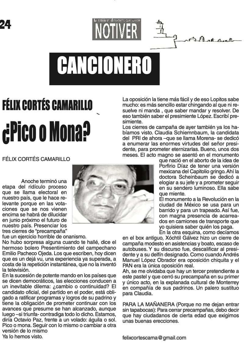 LAS COLUMNAS CANCIONERO - ¿PICO O MONA?- ANOCHE TERMINÓ UNA ETAPA DEL RIDÍCULO PROCESO QUE SE LLAMA ELECTORAL... ¿PICO O MONA? 19 enero 2024 Más Noticias SIN TACTO | DEMENCIA SENIL - Hay una enfermedad mórbida en México que nos afecta de una manera que por lo general no se quiere reconocer. Es el Síndrome de Demencia Senil (SDS), que en México padecen un millón 300 mil personas, cerca... ACERTIJOS | JOSERRA EL PROTAGONISTA - La semana estuvo llena de protagonismos, uno de ellos José Ramón Fernández, el gran Joserra, quien presentó su libro que ahí voy leyendo a medias y que pronto comentaré. Tuvo tantos y tan buenos invitados, que... CANCIONERO | Las carambolas de Barcelona - Yo no sé de quién fue la idea, sospecho que de los estrategas de Pedro Sánchez, quién junto con la señora presidente con A de mujer Claudia Sheinbaum, son los únicos que pueden llamarse ganadores... TEXTO IRREVERENTE | EMBARCADOS - El barco fantasma, inventado por la zacatecana Rocío Nahle, nunca existió. Tampoco las chapopoteras naturales generaron el derrame de petróleo que manchó 900 kilómetros en el litoral... A MIL POR HORA | - **Diario de la muerte **Mil niños huérfanos **Tiros en la madrugada **Recuento de daños DE MÉDICO, POETA Y | EL TEMBLOR DEL TIEMPO... - Ayer por la noche, en el programa de radio, hablamos de la **[Enfermedad de Párkinson ...Un tema que, aunque médico, trasciende lo clínico y se instala en lo profundamente... TURISMOLOGO | PROTEGE A LOS AVIADORES - Además de los pilotos y copilotos aviadores, en una aeronave también existen las y los sobrecargos, como los llamados popularmente "señaleros" que se encuentran sobre las pistas de... A MIL POR HORA | - **Ilustre jarocho **El Chango Cabral **Robots futbolistas **El hijo de papi... DIARIO DE UN REPORTERO | EL PUEBLO SOMOS MUCHOS - Hablemos en serio. Más allá de las desafortunadas declaraciones de la presidenta Claudia Sheinbaum sobre asuntos que van desde los viajes espaciales hasta la gasolina que hay... SIN TACTO | LA ZONA DE CONFORT - Ya en otras ocasiones he comentado sobre cómo la mercadotecnia está montada en la táctica de mantener entre el público un sentimiento de insatisfacción, sustentada en la idea de que la presunción de que…