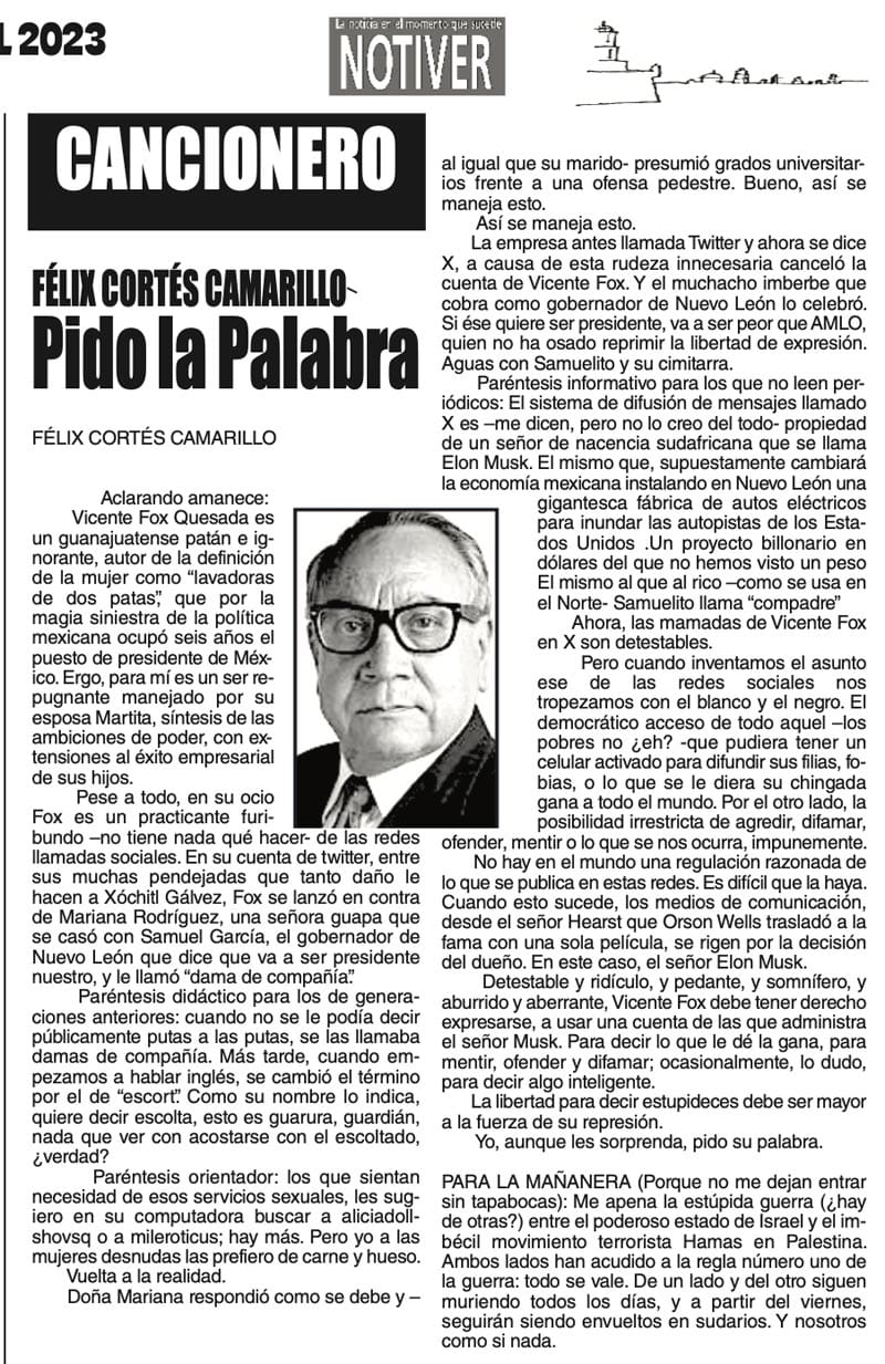 LAS COLUMNAS CANCIONERO - PIDO LA PALABRA CANCIONERO - PIDO LA PALABRA... 30 noviembre 2023 Más Noticias TEXTO IRREVERENTE | HANAMI 2026 - En Europa, como en parte de Asia, la primavera no se considera que llegó plenamente hasta el Hanami. Es decir, cuando florecen los cerezos. Hanami es la palabra nipona para definir la... A MIL POR HORA | - **Del periodismo al cine **La vida en muletas **Héroes populares **Trilogía de dioses... ACERTIJOS | EL PILOTO AUSENTE - Hace unos días recibí un correo mensaje de doña Tania Velásquez, madre de un piloto orizabeño, recién fallecido en accidente de aviación, a sus 22 años: “Sr Gilberto, usted a mí no me conoce, mi nombre es Tania... SIN TACTO | ORDEN EN LA LEGISLATURA - Una vez que fueron domados los efluvios principescos de las viudas de Cuitláhuac que consiguieron seguir untadas en la ubre presupuestal en este sexenio, la Legislatura ha proseguido el camino de la buena... A MIL POR HORA | - **Filosofía popular **Frasecitas célebres **Ángel de la guarda **La huella de Nahle... TEXTO IRREVERENTE | BIEN CUMPLIDORA - Nadie, absolutamente nadie, puede acusar al exalcalde de Pánuco, Oscar Guzmán de Paz, de ser un mero fanfarrón pues lo que contaba en las cantinas y comilonas resultó cierto: la gobernante Rocío Nahle “se la... ACERTIJOS | ELEMENTAL MI QUERIDO ROMO - Cuando se desarrollaba la contienda entre AMLO y Anaya y los del PRI y amigos que le acompañaban. La contienda se veía apretada. Ricardo Anaya repuntaba pese al riqui-riquin-canallín-, pero Peña Nieto... CANCIONERO | LA PAZ MÁS FRÁGIL - Noventa minutos antes de que se venciera el plazo perentorio que Donald Trump le había fijado a Irán, para lanzar en su contra una ofensiva devastadora sobre sus puentes y plantas eléctricas, el presidente... TEXTO IRREVERENTE | SIEMPRE FLOTA - “Lo bofo siempre flota”, se dice aunque no es el adagio original ya que se tomó de la física, concretamente del Principio de Arquímedes que estipula que “todo cuerpo total o parcialmente sumergido en un... ACERTIJOS | EL PARIENTE ARQUITECTO - Es un primo muy querido. Hijo del jalapeño arquitecto Hermas Haaz Pavón, hermano de mi padre Enrique. Desde chicos nos tratamos, trato de presumir a la familia pues fue y es un arquitecto renombrado y jubilado…