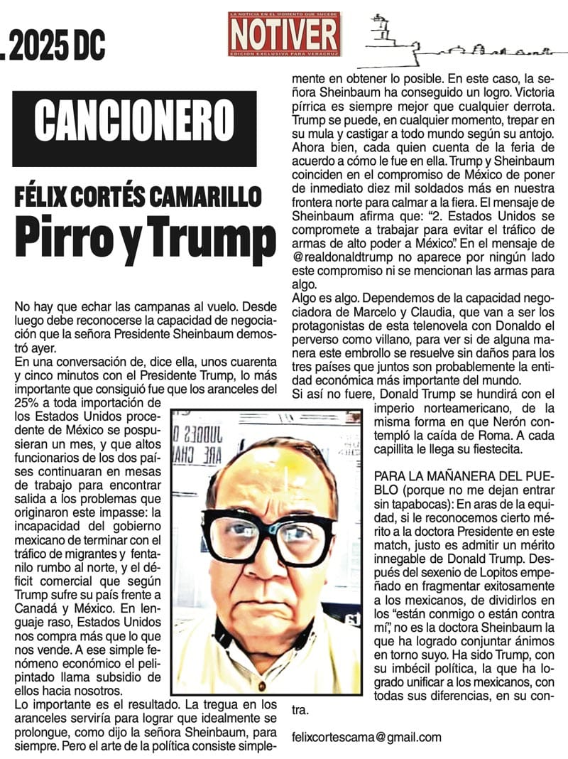 CANCIONERO | PIRRO Y TRUMP - No hay que echar las campanas al vuelo. Desde luego debe reconocerse la capacidad de negociación que la señora Presidente Sheinbaum demostró ayer. En una conversación...