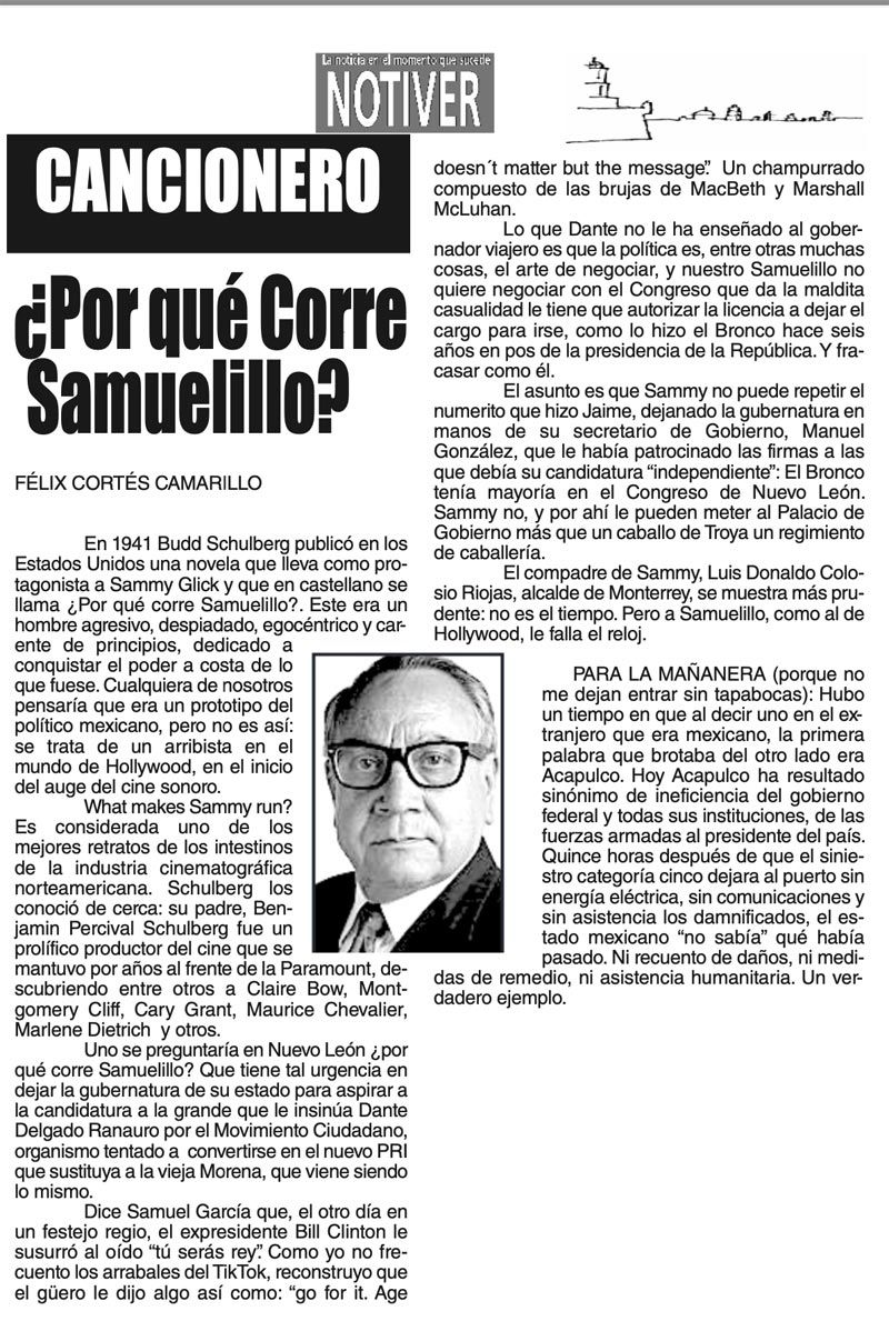 LAS COLUMNAS CANCIONERO -¿Por qué Corre Samuelillo? ¿Por qué Corre Samuelillo? 26 octubre 2023 Más Noticias LAS COSAS COMO SON | - MAS QUE UN DIARIO... TEXTO IRREVERENTE | LE VA A 'ECHAR GANITAS' - Al parecer, el asunto es 'chimoltrufiar' o sea lo mismo decir una cosa que otra. En marzo, el gobierno estatal informó que el programa de rehabilitación de carreteras y caminos conocido como "Bachetón"... ACERTIJOS | EL QUINTO PARTIDO - En la historia de los mundiales, México nunca ha jugado el quinto partido fuera de casa. Lo más que hemos alcanzado es el cuarto juego y de allí nos mandan a casa… A MIL POR HORA | - **Un matrimonio feliz **Apocalipsis jarocho **La isla de los pedófilos **“Amor con amor se paga”... A MIL POR HORA | - **Chicas más guapas **Días revolcados **Fascinantes artistas **Academia de Ególatras... CANCIONERO | EL PAN Y EL LLORO - Nada es accidental en la política. Este fin de semana, la señora presidente con A de patria tendrá una magna concentración de sus seguidores para celebrar el aniversario... TEXTO IRREVERENTE | ENNOCHEBUENADOS - La mercadotecnia adelanta todo y, ni modo, hay que lidiar con eso. Cuando todavía no acababa noviembre ya se vendían productos navideños y ahora mismo por doquiera se ven locales adornados con ese motivo... SIN TACTO | LAS VÍSPERAS - ¿Se acuerda la memorable lectora? ¿Recuerda el memorioso lector?: “Ya va llegando diciembre y sus posadas. Se va acercando ya también la Navidad. El año nuevo... LAS COSAS COMO SON - VAYA CINISMO... TEXTO IRREVERENTE | AÑO BUENO, AÑO MALO - El 2024 fue un año de suerte y abundancia. Este 2025 ha corrido en su contra con infortunio político y mediático. ¿‘Annus horribilis’? Tal vez no llega a tanto, pero sí desastroso y confirmatorio de sus...